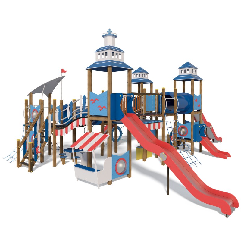 Лабіринти, гірки різної висоти, сходи - елементи, які складають єдину конструкцію і з'єднуються між собою переходами різної конфігурації. Підйоми та спуски також приєднуються до платформи. Інженери, конструктори, дизайнери продумали обладнання до найдрібніших деталей. Виріб не містить гострих кутів об які може травмуватися дитина. Всі деталі пофарбовані абсолютно нешкідливою для здоров'я фарбою. Покриття запобігає корозії, захищає конструкцію від несприятливого впливу погодних умов, механічних пошкоджень, вигорання.