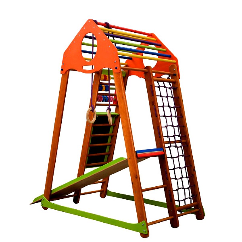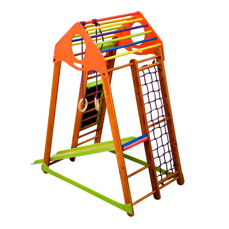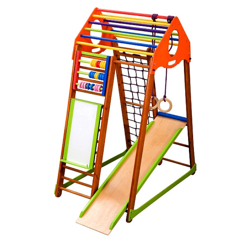 Дитячий спортивний комплекс для дому BambinoWood – прекрасний помічник для дбайливих батьків, і найкраще місце для ігор та занять їх рухомих і цікавих малюків. Легкий, компактний і багатофункціональний спортивний комплекс прекрасно поміститься навіть в малогабаритній квартирі. Цей дитячий спортивний комплекс розрахований на найменших спортсменів, віком від 1 року до 5-7 років. Конструкція виробу створена з урахуванням всіх фізіологічних особливостей розвитку дітей раннього та дошкільного віку. Дитячий спортивний комплекс для дому BambinoWood пройшов всі необхідні перевірки якості і відповідає існуючим вимогам міжнародної сертифікації РЄ і TUV. Для виготовлення дитячого спортивного комплексу для будинку BambinoWood використовуються тільки якісні сертифіковані матеріали, які відповідають вимогам ГОСТу:натуральний бук і сосна, вирощені в екологічно чистих областях України. Слід зазначити, що натуральна деревина ретельно обробляється і висушується на власному виробництві компанії "PLAYBABY", а потім акуратно шліфується до абсолютної гладкості і розкривається лаком, який не має запаху і відмінно захищає деревину від руйнувань і вологи. Можлива комплектація : шведська стінка; гладіаторські сітка; рукоход; дитяча гірка;який не має запаху і відмінно захищає деревину від руйнувань і вологи. Зверніть увагу, що округлі ручки, розташовані нагорі вироби, ви можете використовувати як для його зручного перенесення, так і для кріплення додаткових спортивних елементів. Довжина гірки: 150 см. Матеріал: сосна. Перекладини: бук. Мотузка: поліпропілен. Вид кріплення: не вимагає кріплення.