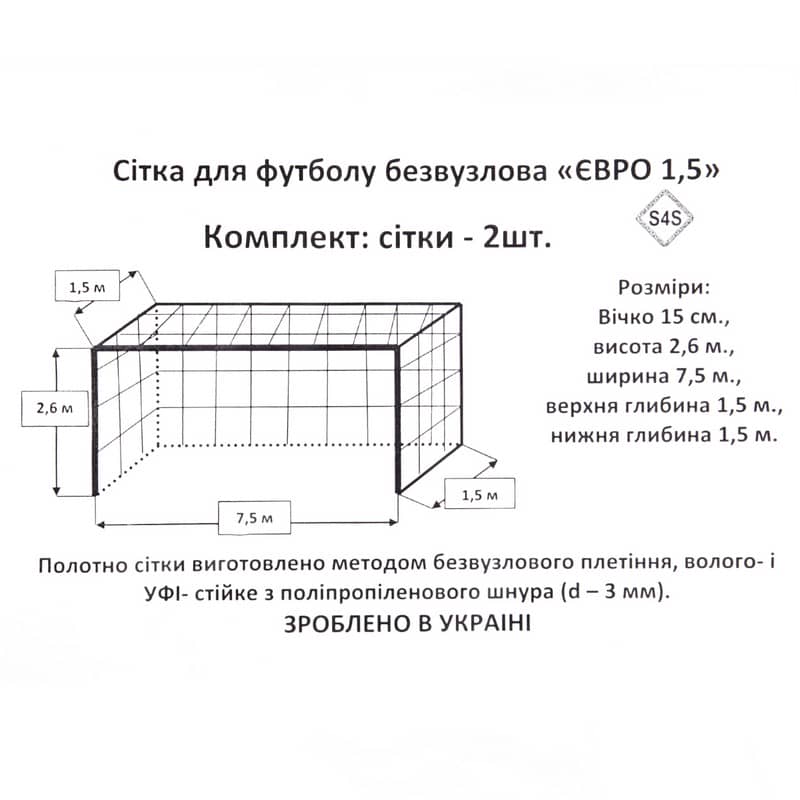 Сітка на ворота футбольні PlayGame ЄВРО 1 тренувальна безузловая 2 шт, код: SO-2320-S52