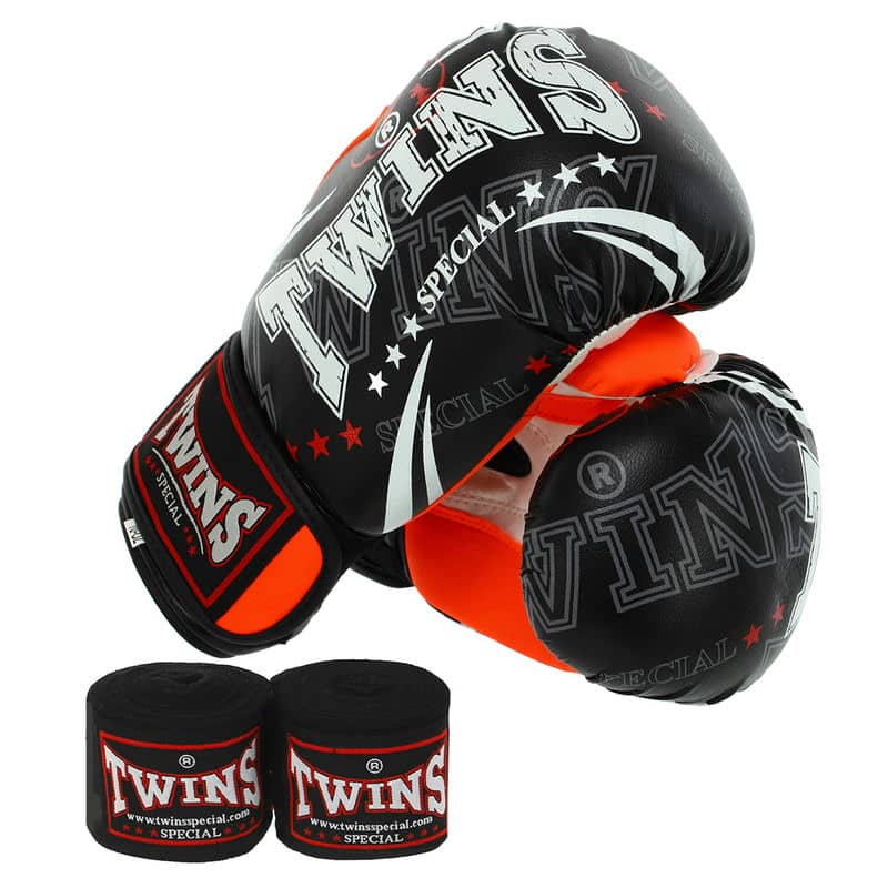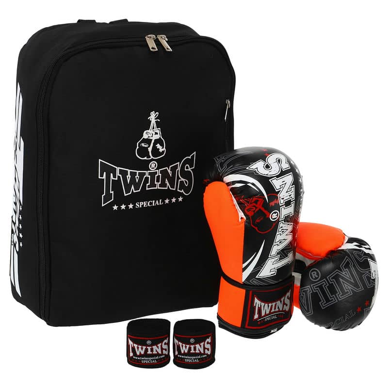 Боксерський набір 3в1 Twins 6 унцій, чорний-помаранчевий, код: BO-9943_6BKOR