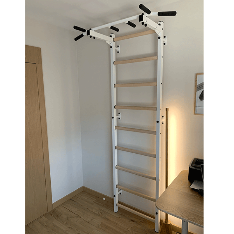Шість ручок з нековзною поверхнею дозволяють та полегшують виконання різноманітних вправ. Кожна щабель виготовлена з масиву бука та вручну змащена двома шарами органічної олії на основі лляної олії, яка дозволена для контакту з харчовими продуктами. Поєднання натурального дерева та металу створює ідеальний, стильний предмет спортивних меблів для сучасного інтер'єру дому чи офісу.