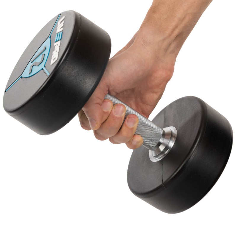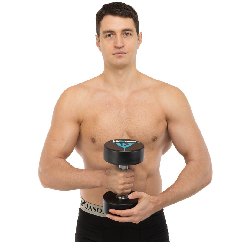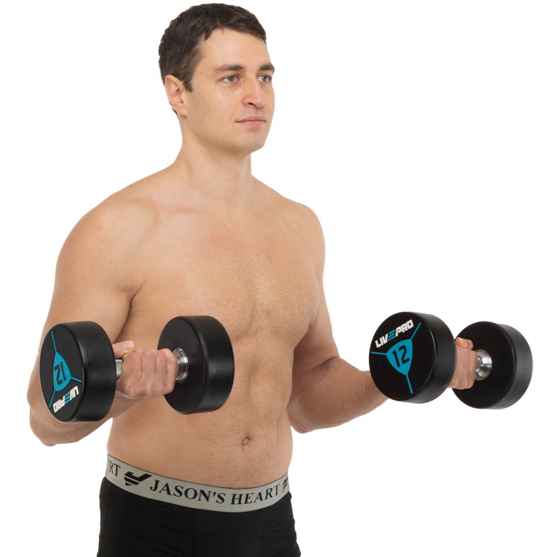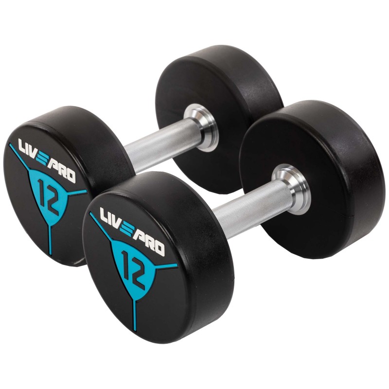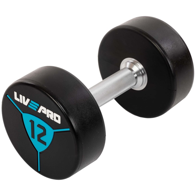 Гантелі від бренду LiveUp мають суцільну конструкцію і фіксовану вагу. Вони виготовлені зі сталі і покриті поліуретановим покриттям на дисках. Завдяки наявності поліуретанового покриття гантелі не видають зайвого шуму в процесі використання, а також у разі падіння не пошкоджують підлогове покриття в залі та інший інвентар. У комплекті дві гантелі однакової ваги і розміру.