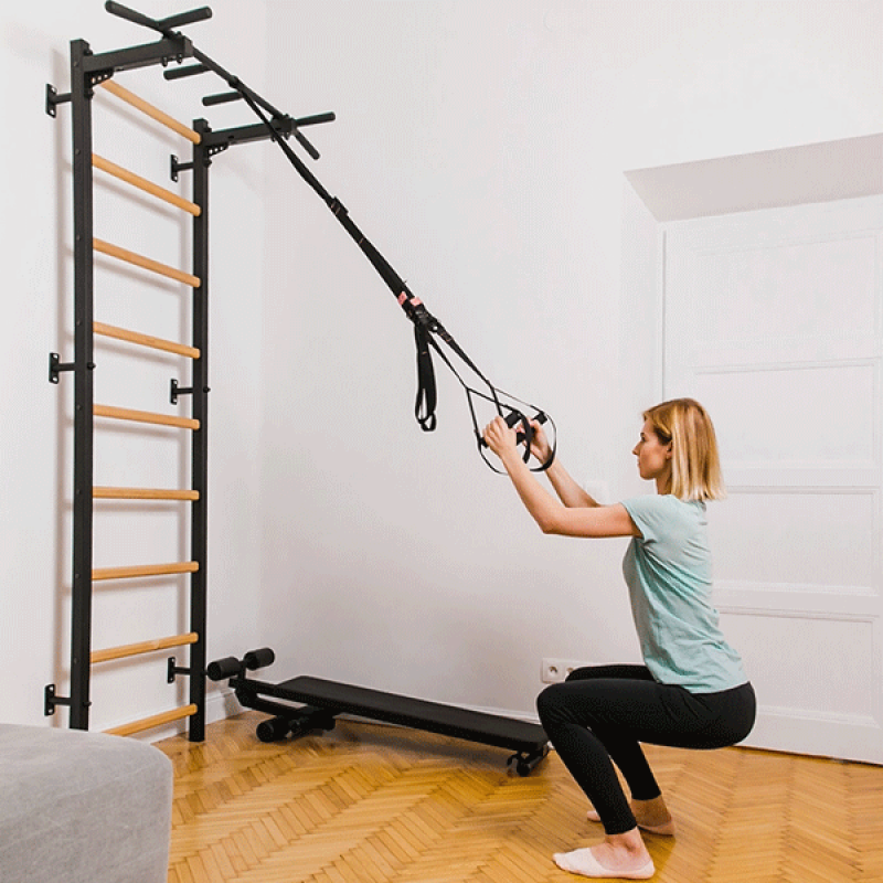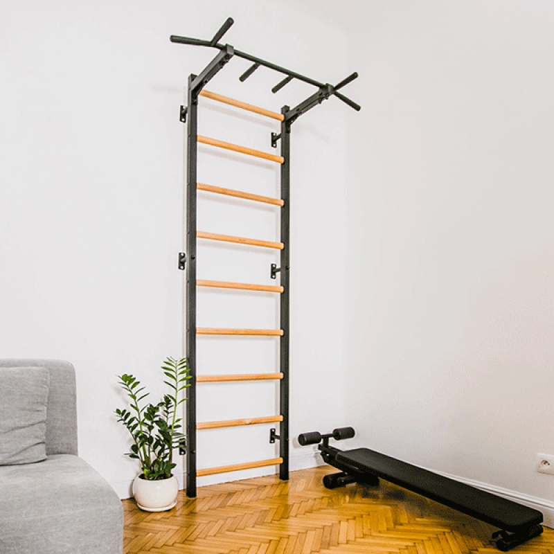 Шведську стінку BenchK 721B можна оснастити додатковим обладнанням, таким як турнік DB1B та тренувальна лава B1B, створюючи повноцінний домашній спортзал площею всього 1 квадратний метр.