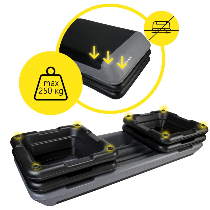 Професійна степ-платформа Cornix Pro стане ефективним рішенням для формування домашнього міні-залу або професійної студії, де потрібне обладнання, здатне витримати активний темп та забезпечити користувача впевненістю у кожному русі. Продукт створює оптимальні умови для побудови результативних тренувальних програм, спрямованих на розвиток витривалості, зміцнення м'язів та покращення загального тонусу. Якщо ви шукаєте інструмент, що працюватиме довго, стабільно та без компромісів щодо безпеки, ця модель - саме той вибір, який дозволить перейти на новий рівень тренувань. Обирайте степ-платформу Cornix Pro і інтегруйте професійну якість у свою щоденну фітнес-рутинy вже сьогодні.