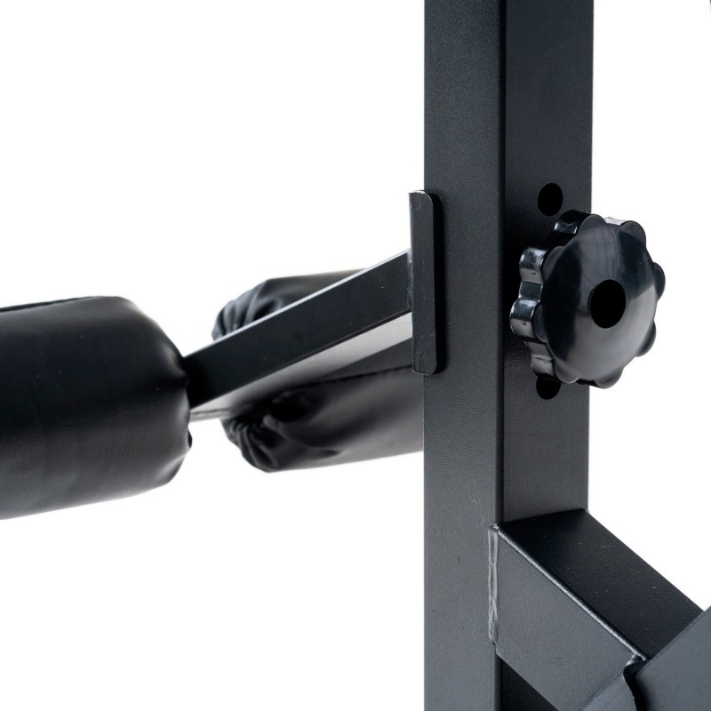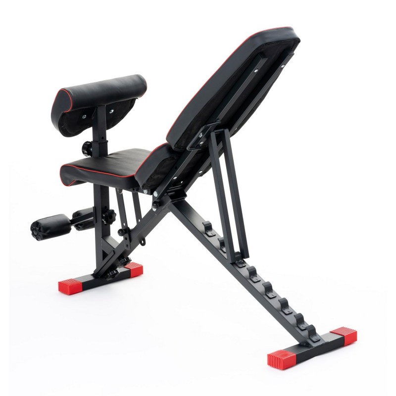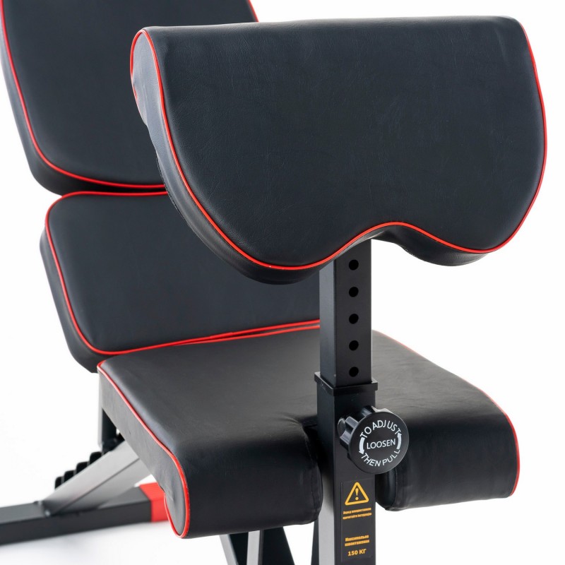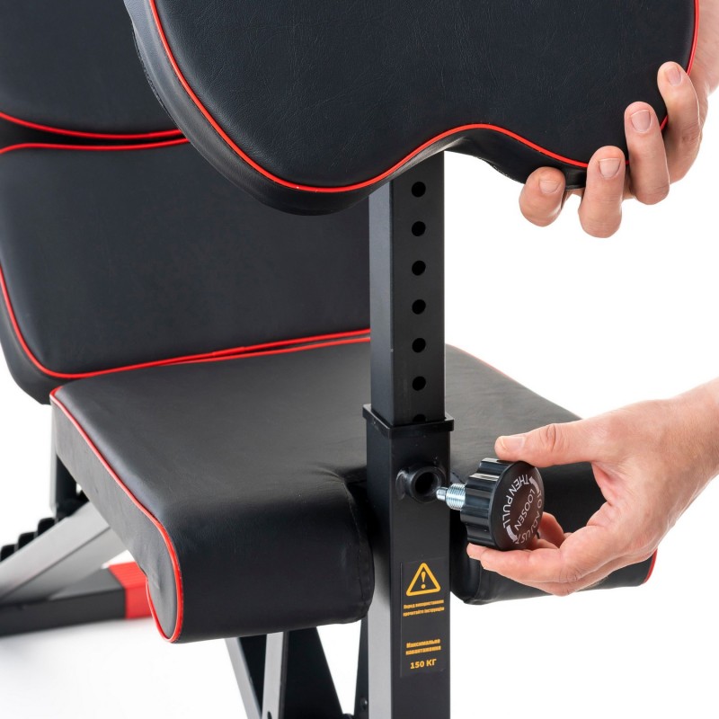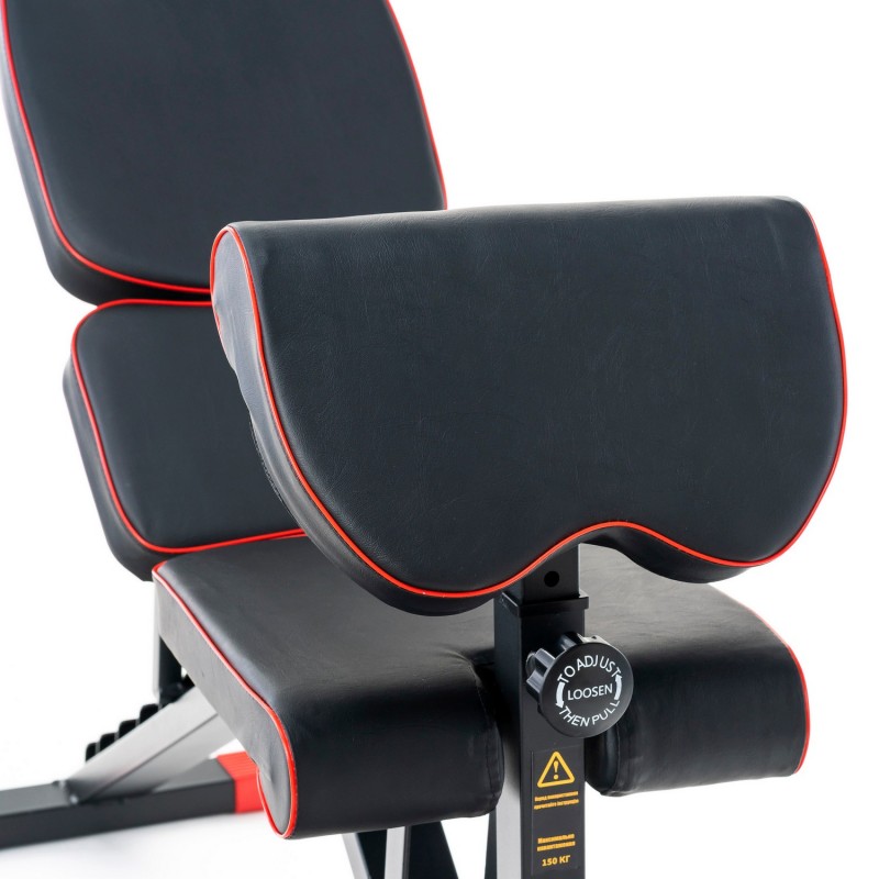 Спинка регулюється в 8 положеннях (-10 ° ... + 90 °), а сидіння - в 4 позиціях, що забезпечує комфортну позицію під час жиму, преса та вправ на біцепс на парті скотту. Приставка для ніг фіксується в кількох положеннях під ваше зростання.