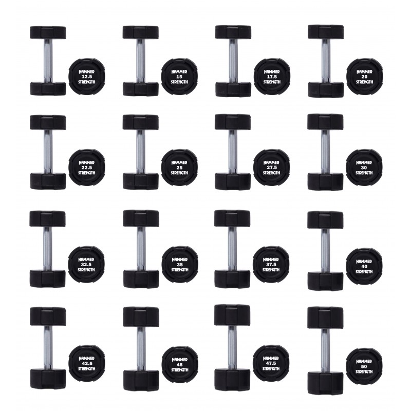 Гантельний ряд 12.5–50 кг Hammer Strength TPU — це професійний набір гантелей, що складається з 16 пар (32 гантелі) із загальною масою 1000 кг. Даний комплект розроблений спеціально для інтенсивної комерційної експлуатації у тренажерних залах із високою прохідністю.