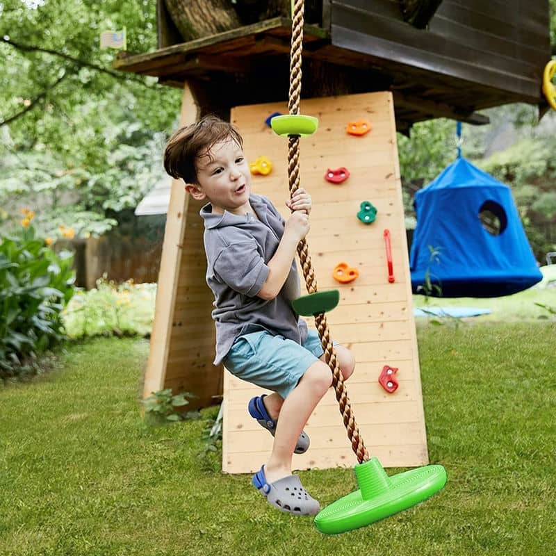 Оновлений дизайн - виготовлений з надміцних матеріалів, міцна конструкція та вантажопідйомність 100 кг гарантують, що ці дитячі гойдалки для скелелазіння прослужать вам і вашій родині протягом багатьох років. Додайте їх в свій поточний набір гойдалок, використовуйте їх як мотузку для лазіння по деревах, підйом по мотузяній драбині або мотузкові гойдалки.