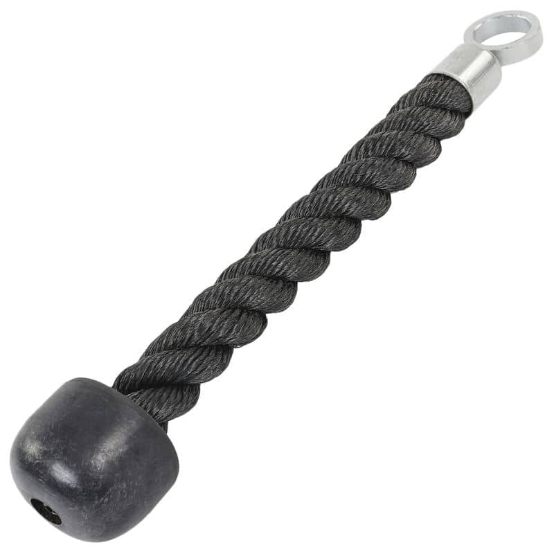 Основою канатної рукояті є міцний плетений трос із високоякісного поліпропіленового волокна. З одного боку до нього прикріплений міцний металевий підвіс із вушком під карабін, що дозволяє використовувати цей аксесуар практично на будь-якому блочному тренажері. З іншого боку, надійно зафіксований великий гумовий упор для запобігання зісковзування руки під час тренування. Вона дозволить повною мірою використати його потенціал.