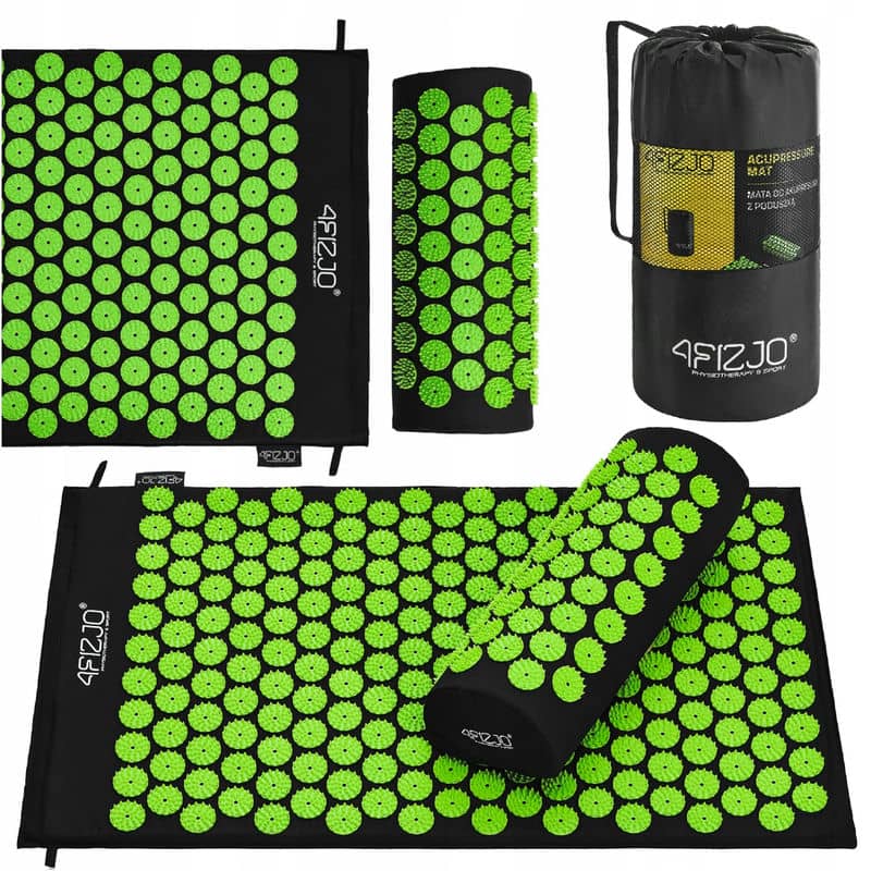 Акупунктурний килимок від 4Fizjo виконаний з екологічних матеріалів: накидка з натуральної бавовни, пінополіуретановий наповнювач та аплікатори з гіпоалергенного пластику. Кожен аплікатор має 42 голки, що майже вдвічі більше ніж в інших виробників. Тисячі голок на поверхні килимка стимулюють тканини виділяти ендорфіни, які мають болезаспокійливу дію та приносять полегшення втомленим м'язам. Валик, що йде у комплекті, необхідно підкладати під шию або стопи, його можна застосовувати самостійно або в парі з килимком.
