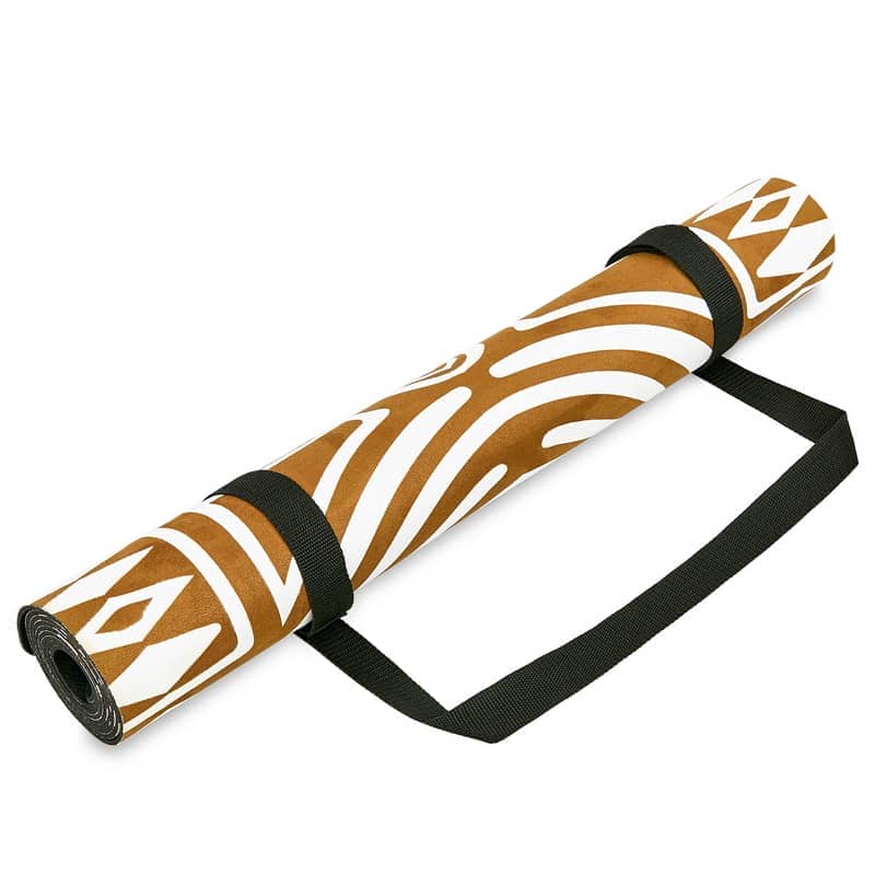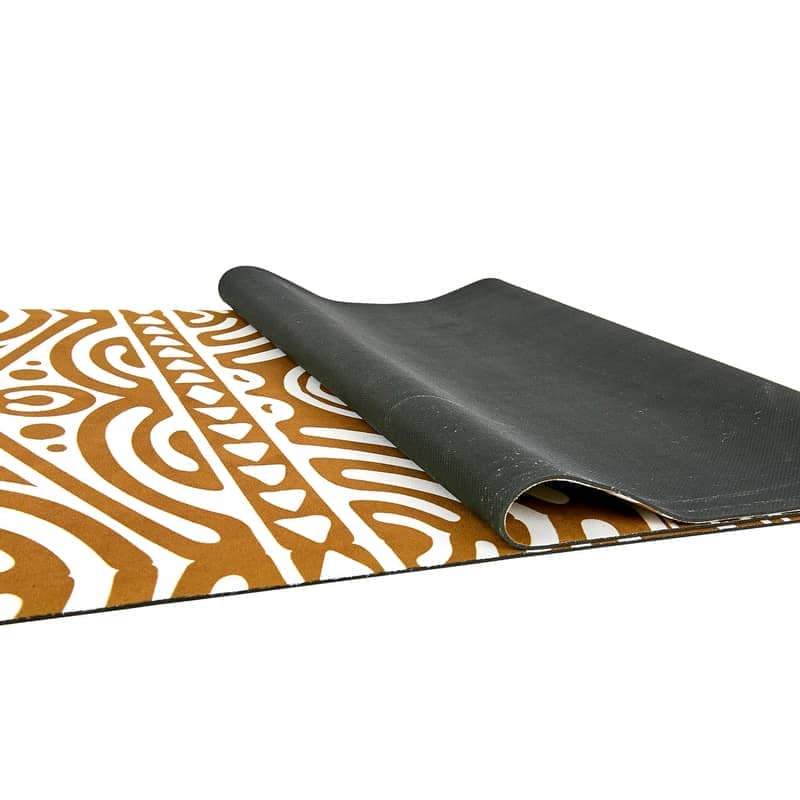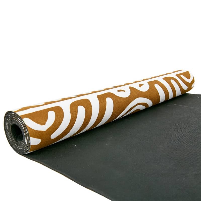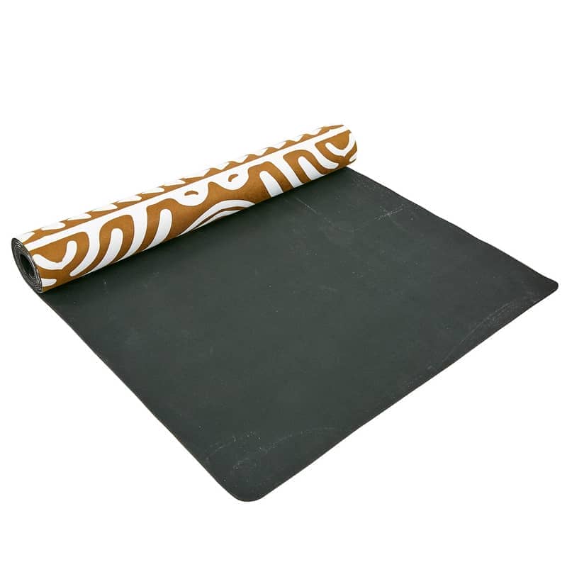 Двошаровий килимок складається з шару каучуку та шару замші. Замшевий верх має цікавий принт, який дає змогу не тільки комфортно тренуватися, а й отримувати естетичне задоволення від занять. Лицьова поверхня килимка не слизька. Відмінною липкістю володіє тильна сторона, виготовлена з каучуку. Цей матеріал добре прилипає до різних покриттів і точно не буде ковзати.