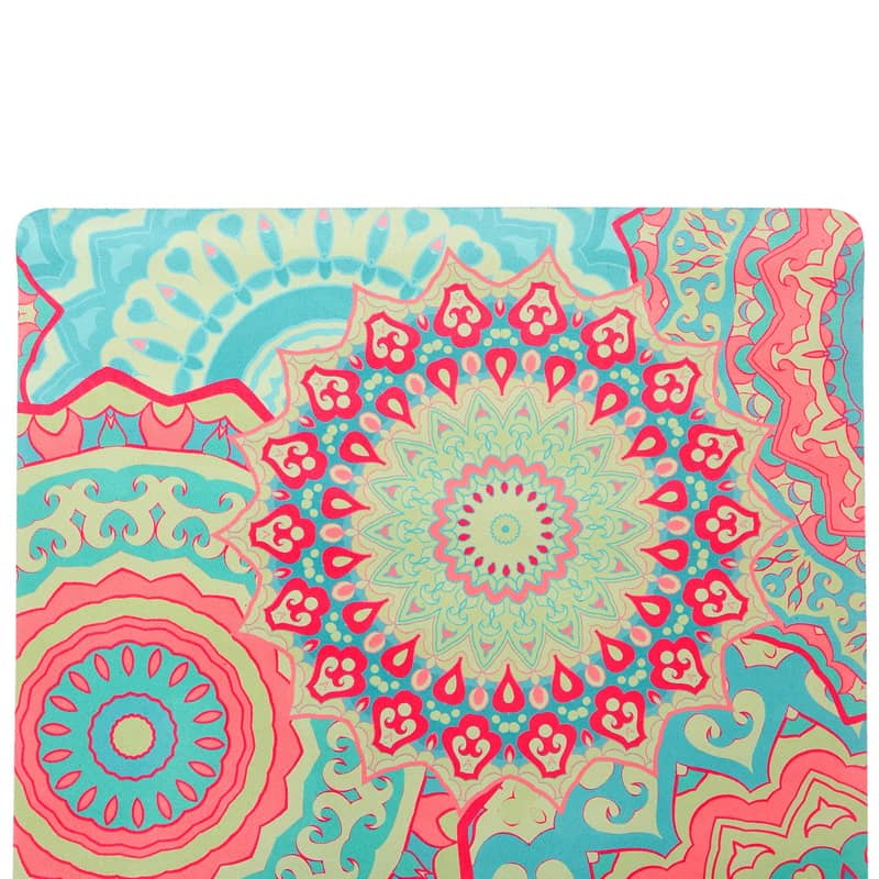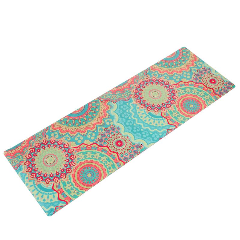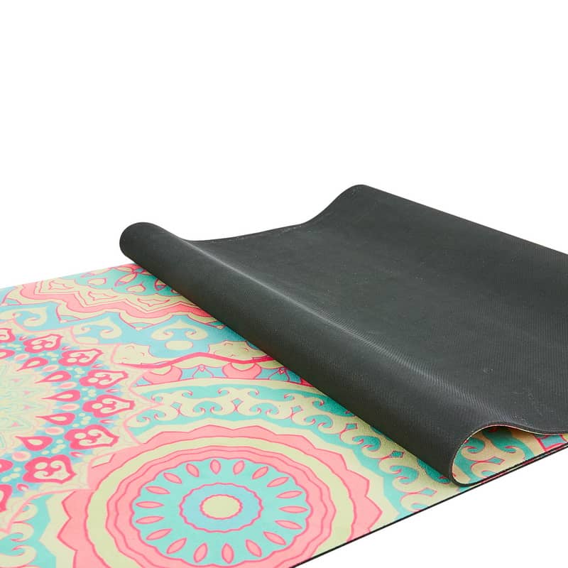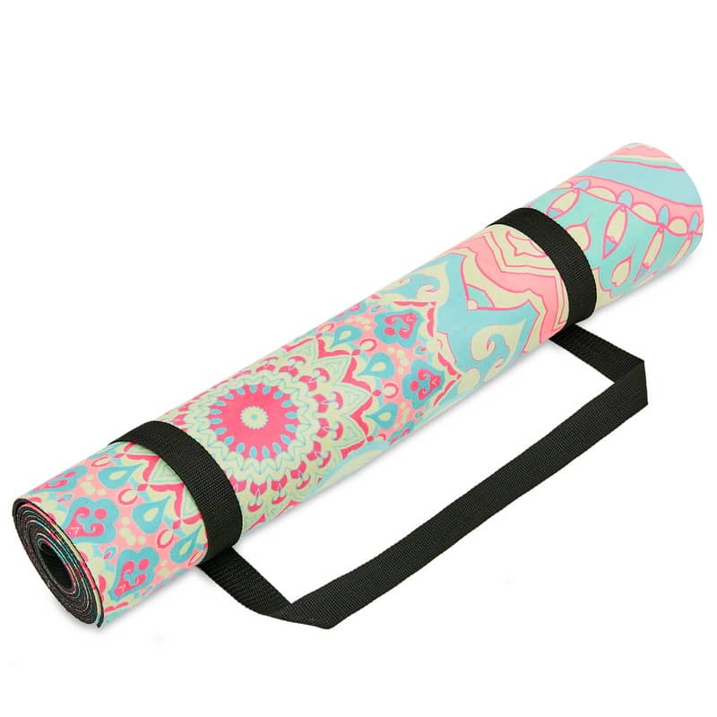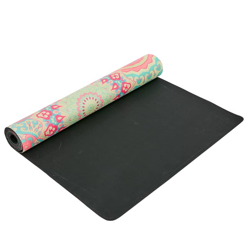 Двошаровий килимок складається з шару каучуку та шару замші. Замшевий верх має цікавий принт, який дає змогу не тільки комфортно тренуватися, а й отримувати естетичне задоволення від занять. Лицьова поверхня килимка не слизька. Відмінною липкістю володіє тильна сторона, виготовлена з каучуку. Цей матеріал добре прилипає до різних покриттів і точно не буде ковзати.
