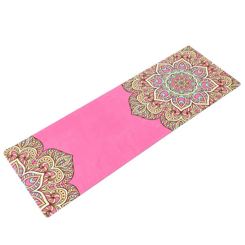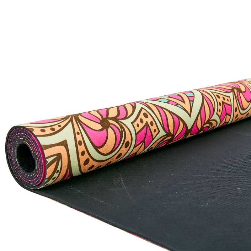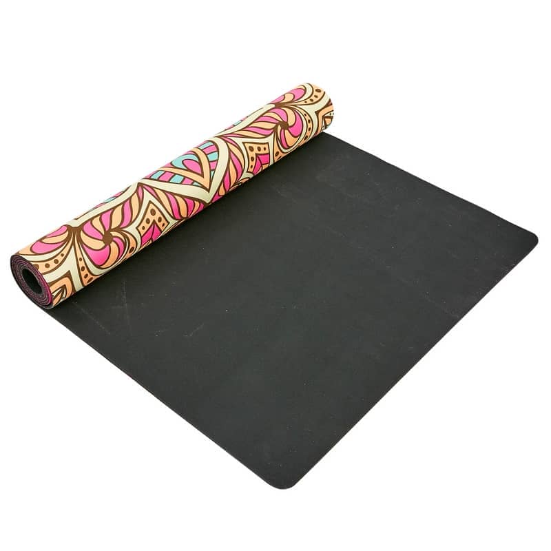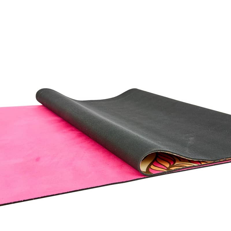 Двошаровий килимок складається з шару каучуку та шару замші. Замшевий верх має цікавий принт, який дає змогу не тільки комфортно тренуватися, а й отримувати естетичне задоволення від занять. Лицьова поверхня килимка не слизька. Відмінною липкістю володіє тильна сторона, виготовлена з каучуку. Цей матеріал добре прилипає до різних покриттів і точно не буде ковзати.