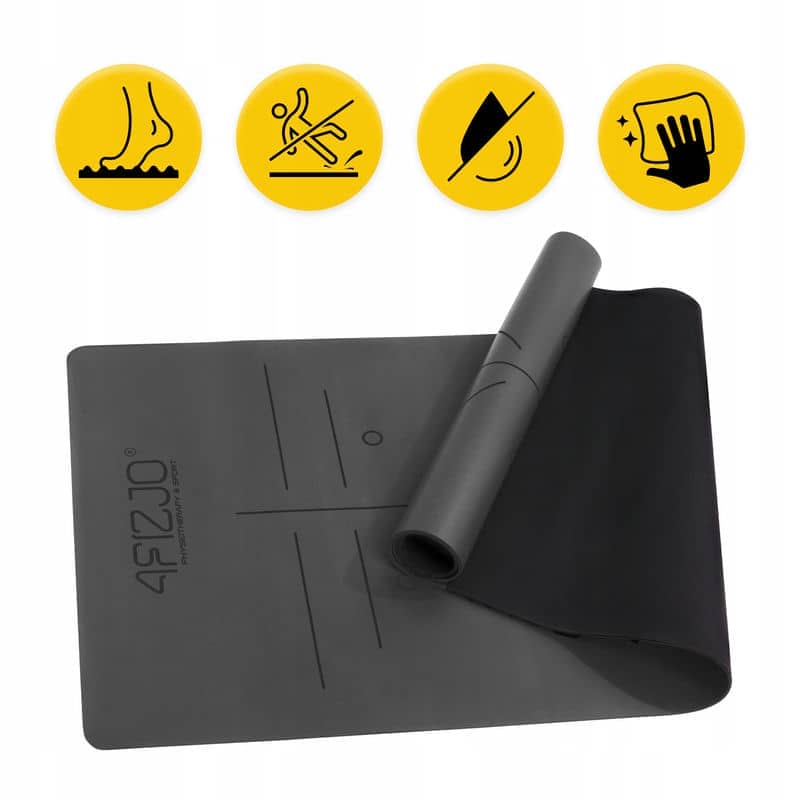 Протиковзкий килимок від 4Fizjo створений з любов'ю до навколишнього середовища. Він виготовлений з міцної, екологічної та біорозкладаної поліуретанової гуми. Цей високоякісний матеріал приємний на дотик та не містить шкідливих домішок. Він має високу міцність на розрив і стійкий до стирання. Відмінний рівень адгезії з поверхнею сприяє безкомпромісному рівню безпеки при тренуваннях. Додатковими його перевагами є водонепроникність та ефективне поглинання звуків від динамічних вправ. Аксесуар дуже простий у догляді, при забрудненні достатньо протерти поверхню вологою ганчіркою. В комплект входить ремінець для зручного скручування та транспортування килимка.