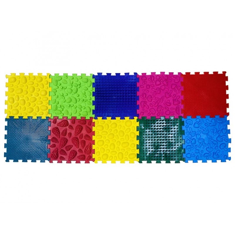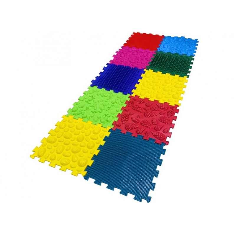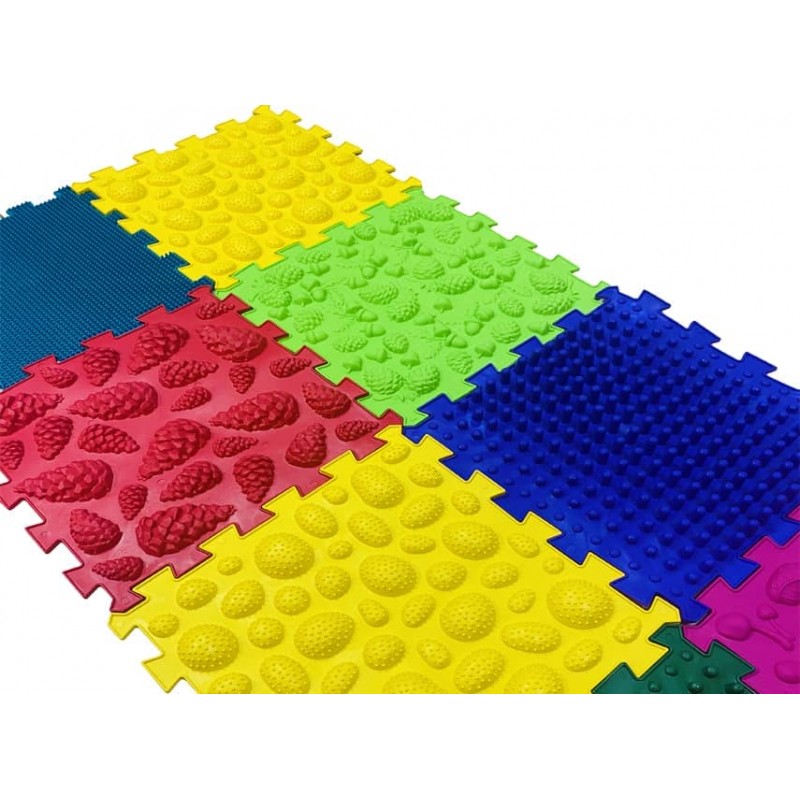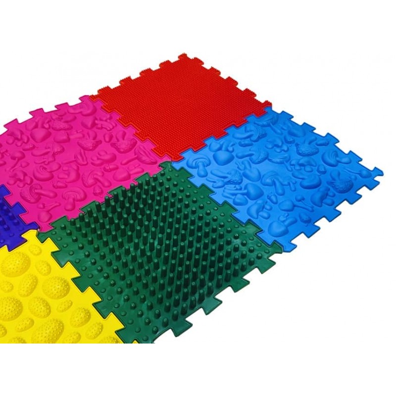 Елементи виготовлені з полівінілхлориду – гіпоалергенного матеріалу. Площу килимка можна змінювати шляхом вибору кількості модулів. Елементи різного кольору з формами рельєфу у вигляді шипів, шишок, їжачків. Килимки можна мити миючим засобом (не допускає використання абразивних засобів для чищення).