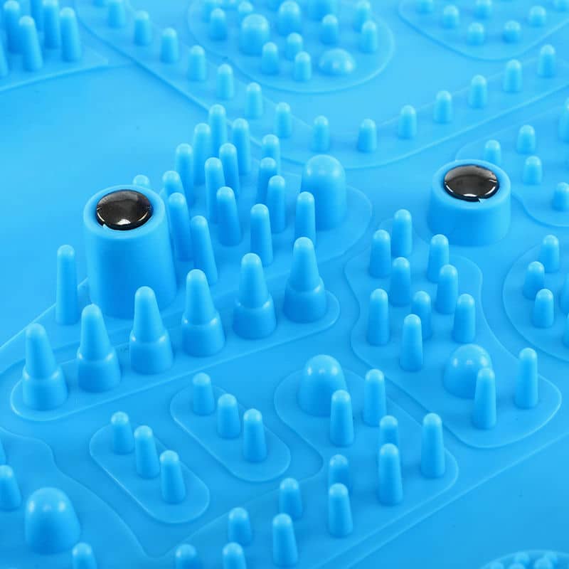 Килимок-пазл ортопедичний масажний гумовий магнітний SP-Planeta ZD-5080 – виріб, який чинить не тільки механічний вплив, але й магнітний, а отже, стимулює імунітет, прискорює обмін речовин. Крім того, на килимок вже нанесено малюнок стопи з неоднаковими за величиною опуклостями. По краях проходять дві смуги з різновеликими масажними елементами.