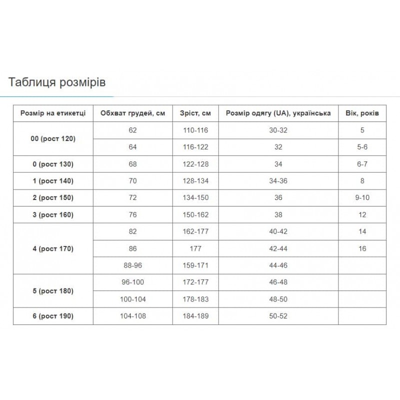Розмір/ріст (см): 00/120, 0/130, 1/140, 2/150, 3/160, 4/170, 5/180, 6/190.