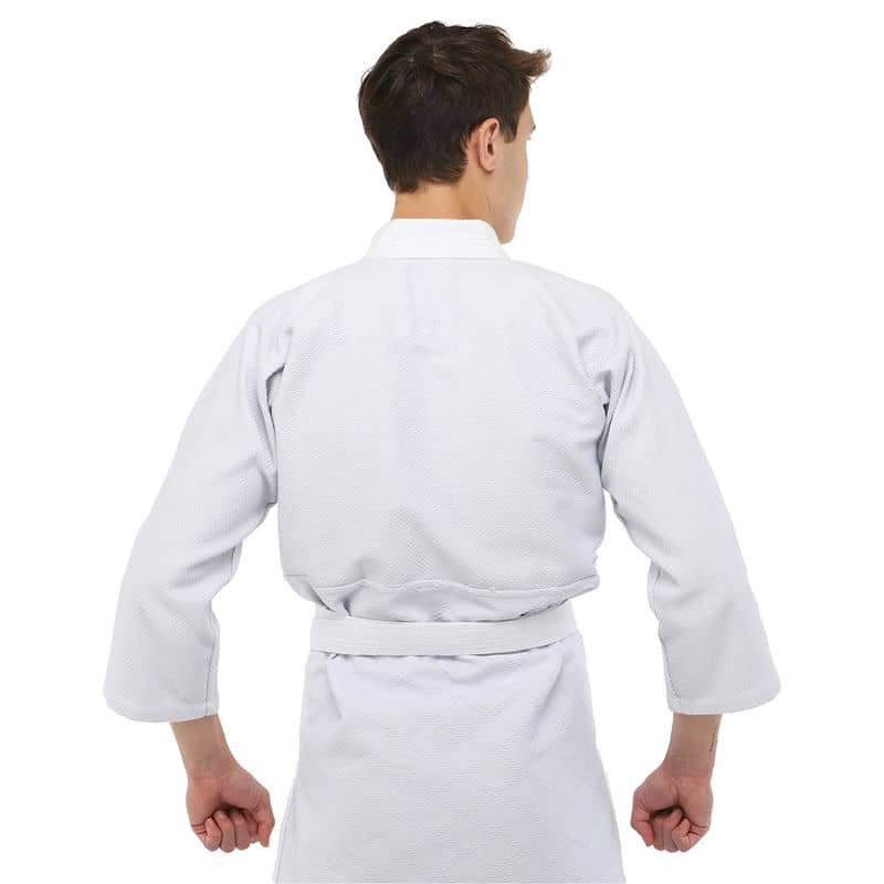 Для виготовлення кімоно використовується натуральне бавовняне волокно – з нього виготовляють тканину особливого плетіння. Вона відрізняється високою стійкістю до деформації на розрив. Посилений відворот кімоно і вставки під рукавами підвищують запас міцності.