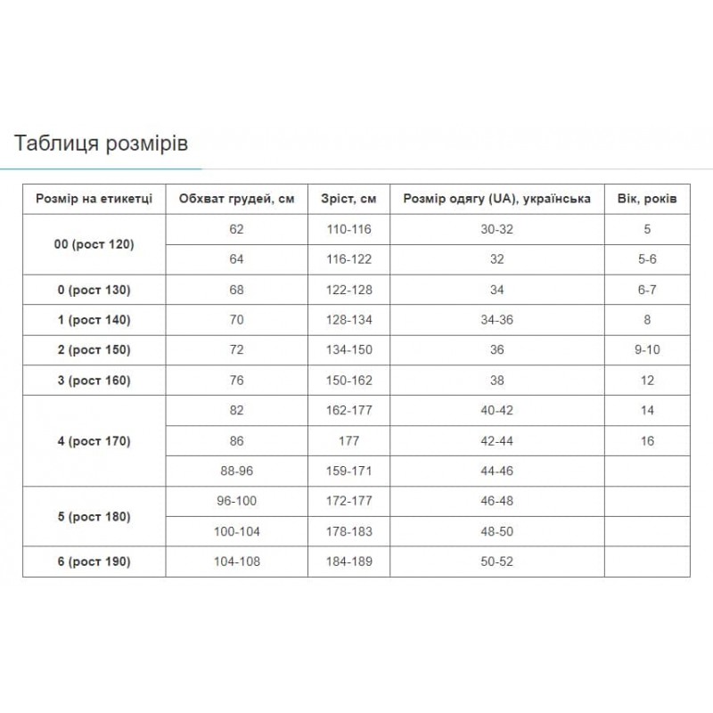 Розмір/ріст (см): 00/120, 0/130, 1/140, 2/150, 3/160, 4/170, 5/180, 6/190.