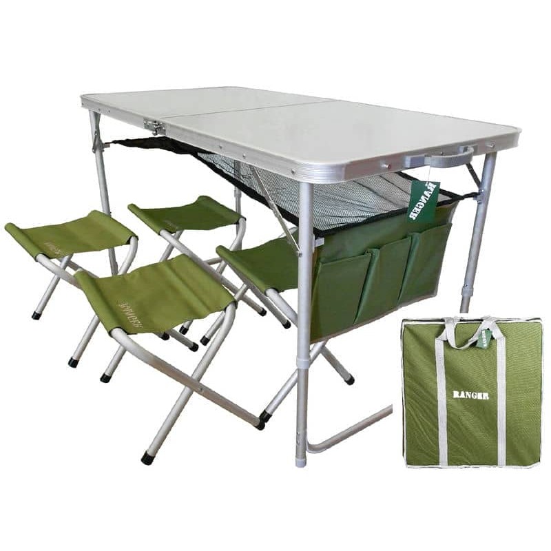 Складаний Пікніковий стіл з чотирма табуретками для сім'ї або невеликої компанії - просто ідеальне рішення. Стіл і стільці дуже просто і швидко розкладаються і складаються. Ніжки столу і стільчиків Не занурюйте в грунт навіть під навантаженням. Ергономічна конструкція ніжок столу (дуги внизу столу) не дозволяє занурюватися в грунт. Низ стільниці посилений ребрами жорсткості, що дозволяє витримувати велике навантаження і зберігати цілісність. Під стільницею є зручна сітчаста полку, а збоку кишені для посуду, продуктів та інших, потрібних на відпочинку речей. У транспортуванні набір меблів для пікніка дуже зручний, так як табуретки укладаються прямо в стіл і закріплюються ремінцем, що полегшує пакування і зберігає цілісність стільниці. Стіл складається навпіл так, що перетворюється в невелику валізку. Упакована меблі поміститься в багажник будь-якого легкового автомобіля.