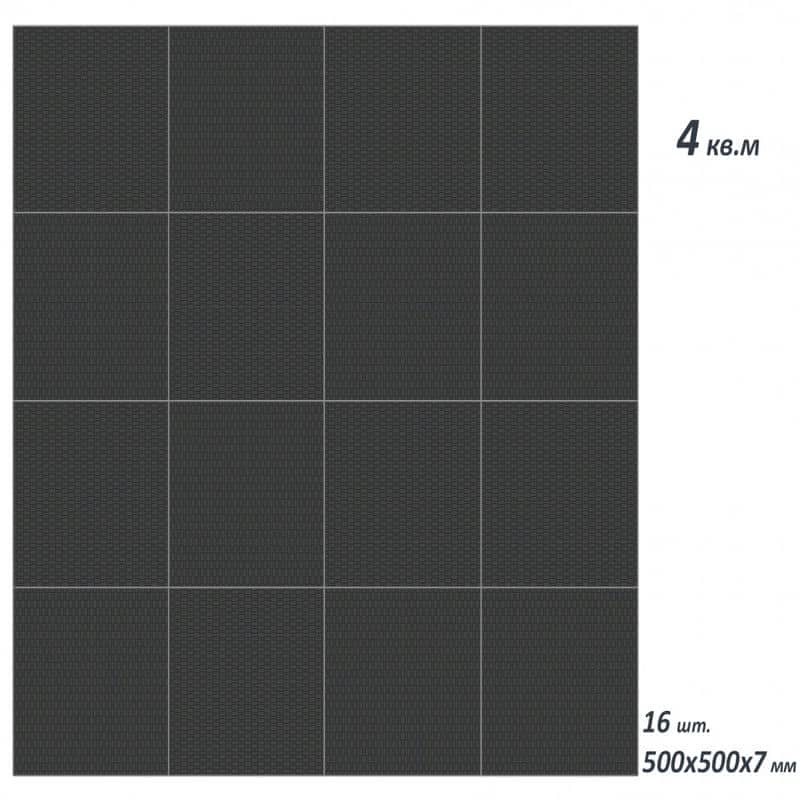Покриття виконане з чистої гуми без домішок, яка не має різкого запаху. Розмір 500 х 500 мм має рівну лицьову поверхню та рельєфну внутрішню, завдяки чому створюється амортизуючий ефект.