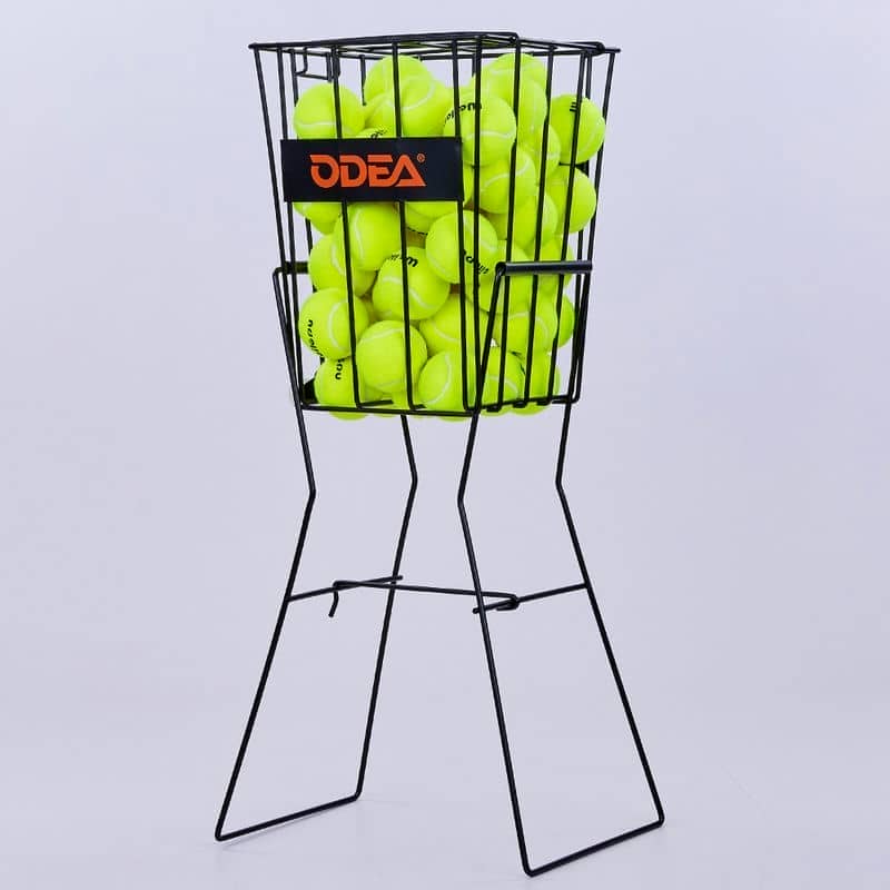 Кошик для тенісних м'ячів ODEAR TENNIS BALL CART BT-0465 являє собою багатофункціональну конструкцію-трансформер. У статичному положенні виріб має форму стоячого кошика зручної висоти, даючи змогу гравцям діставати м'ячі та здійснювати швидкі подачі. Якщо опори підняти, вони перетворюються на ручки для зручного переміщення майданчиком. Для виготовлення кошика використовуються металеві прути зі спеціальним атмосферостійким покриттям. Виріб витримує великі навантаження і стійкий до корозії. На передній частині знаходяться логотипи бренду.