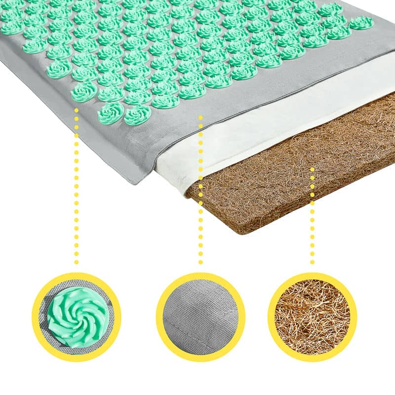 При його виробництві використовуються на 100% екологічно чистих матеріалів. Накидка зшита із лляної тканини, гарантує природність, хорошу проветриваемость і відсутність будь-яких сторонніх запахів. Усередині килимка є товста вставка з натурального кокосового волокна. Картридж має латексну просочення, тому не вбирає вологу і залишається гігієнічним. Кільця з шипами виготовлені з гіпоалергенного ABS пластику за інноваційною технологією Spinning Spikes. Голки закручуються у вир і на верхівці кожної є фокусна точка, що нагадує наконечник стріли. Завдяки чому вони дуже гострі, в той же час і безпечні. Дана структура гарантує максимальний ефект і повне розслаблення. Голчасті кільця надійно прикріплені до полотняному покриттю термічним методом Heat-press, без використання клею. Комплектний чохол-сумка стильний і функціональний, добре провітрюється, а значить килимок буде залишатися сухим і гігієнічним після кожного використання.