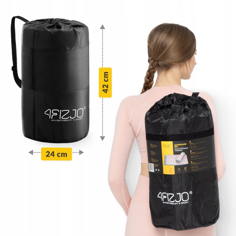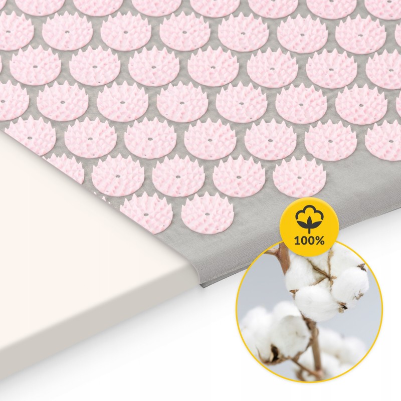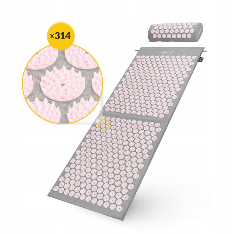 Акупунктурний килимок від 4Fizjo виконаний з екологічних матеріалів: накидка з натуральної бавовни, пінополіуретановий наповнювач та аплікатори з гіпоалергенного пластику. Кожен аплікатор має 42 голки, що майже вдвічі більше ніж в інших виробників. Тисячі голок на поверхні килимка стимулюють тканини виділяти ендорфіни, які мають болезаспокійливу дію та приносять полегшення втомленим м'язам. Валик, що йде у комплекті, необхідно підкладати під шию або стопи, його можна застосовувати самостійно або в парі з килимком.