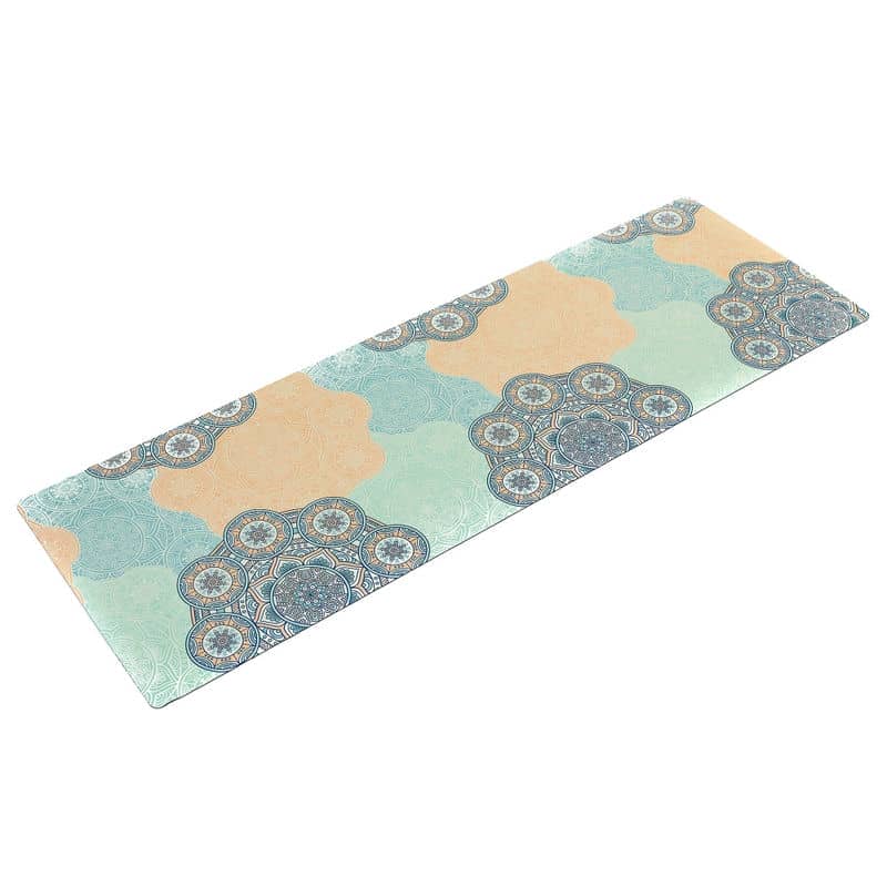 Двошаровий килимок складається з шару каучуку та шару замші. Замшевий верх має цікавий принт, який дає змогу не тільки комфортно тренуватися, а й отримувати естетичне задоволення від занять. Лицьова поверхня килимка не слизька. Відмінною липкістю володіє тильна сторона, виготовлена з каучуку. Цей матеріал добре прилипає до різних покриттів і точно не буде ковзати.