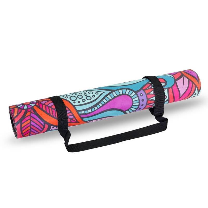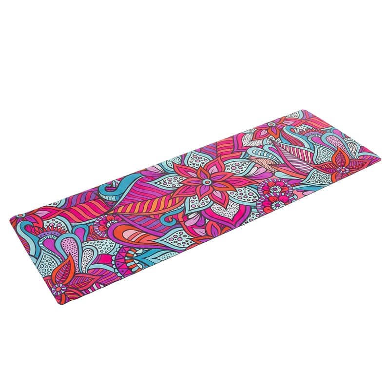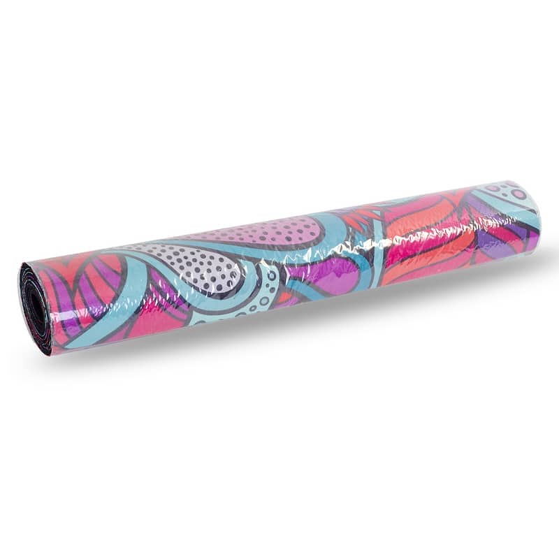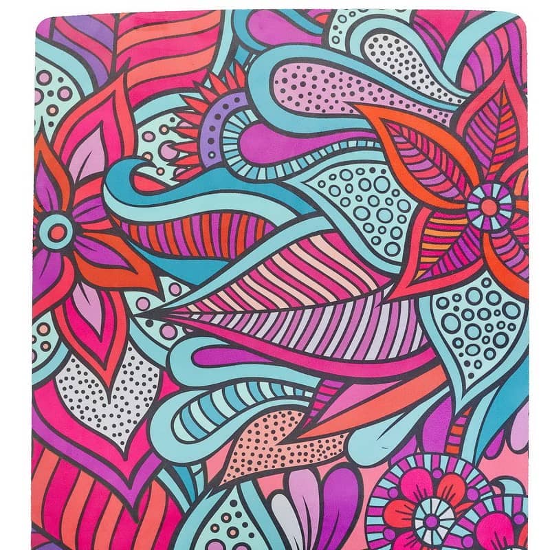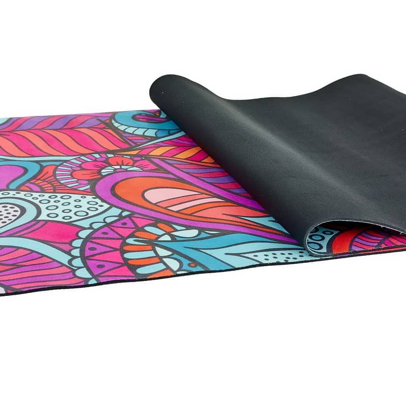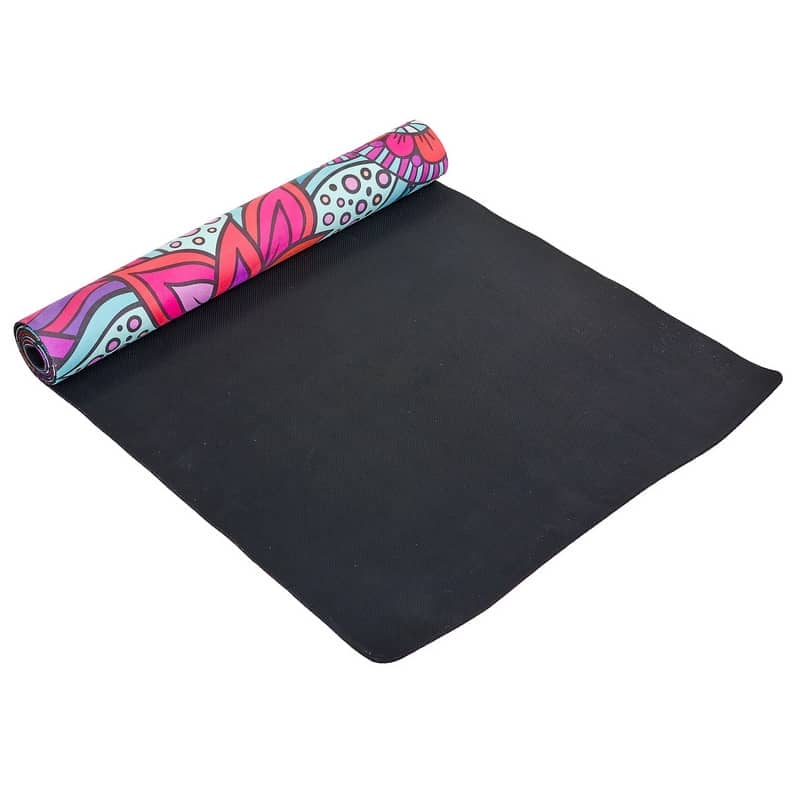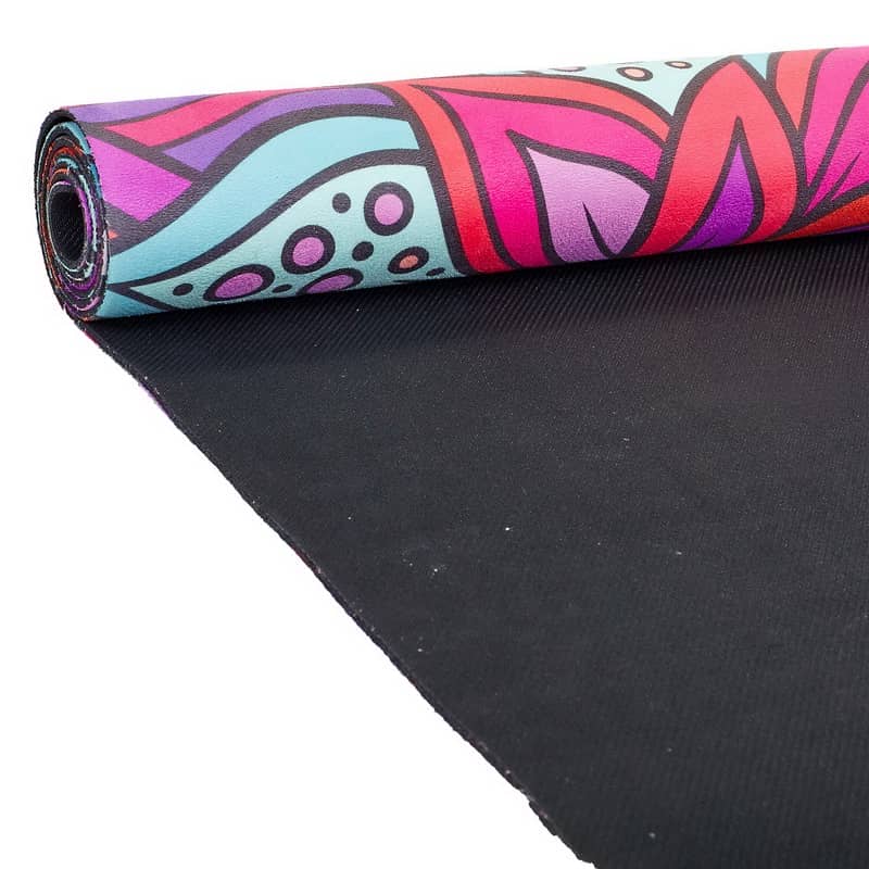 Двошаровий килимок складається з шару каучуку та шару замші. Замшевий верх має цікавий принт, який дає змогу не тільки комфортно тренуватися, а й отримувати естетичне задоволення від занять. Лицьова поверхня килимка не слизька. Відмінною липкістю володіє тильна сторона, виготовлена з каучуку. Цей матеріал добре прилипає до різних покриттів і точно не буде ковзати.