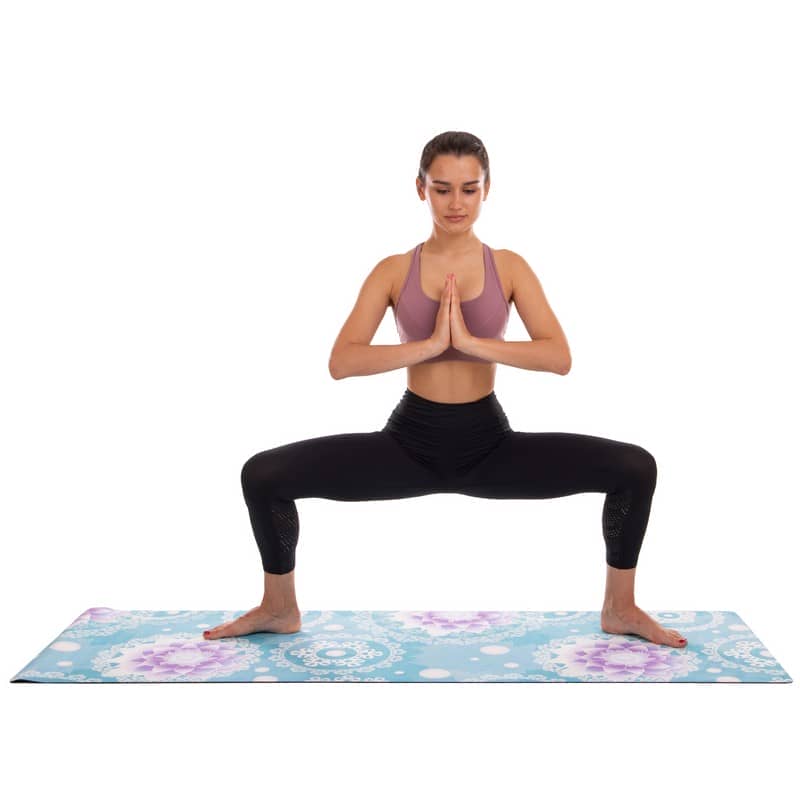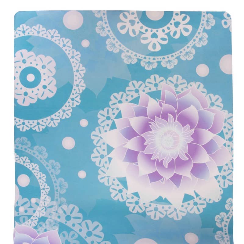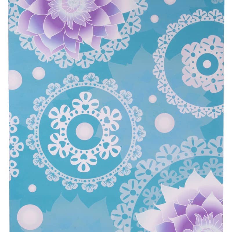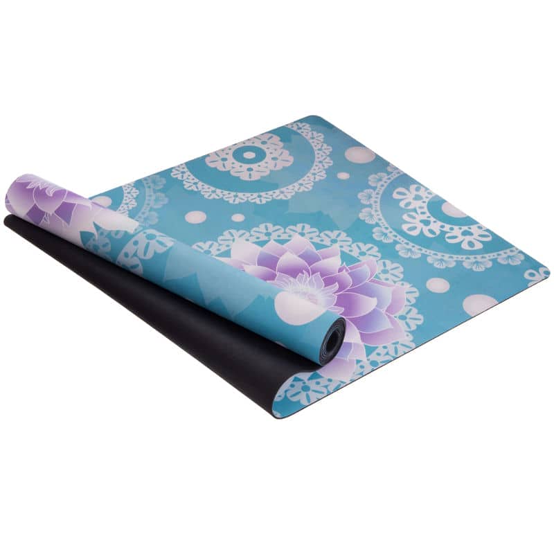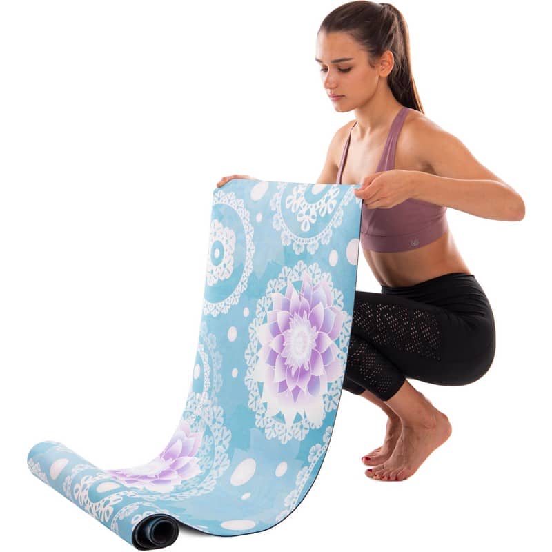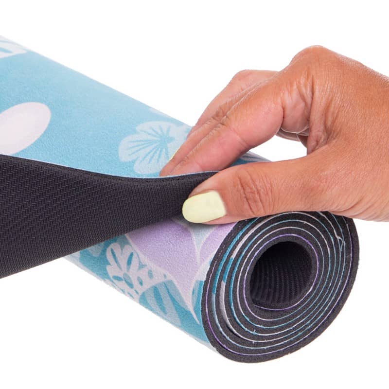 Двошаровий килимок складається з шару каучуку та шару замші. Замшевий верх має цікавий принт, який дає змогу не тільки комфортно тренуватися, а й отримувати естетичне задоволення від занять. Лицьова поверхня килимка не слизька. Відмінною липкістю володіє тильна сторона, виготовлена з каучуку. Цей матеріал добре прилипає до різних покриттів і точно не буде ковзати.