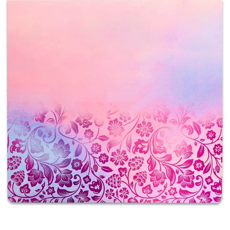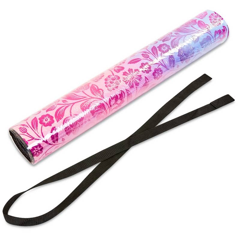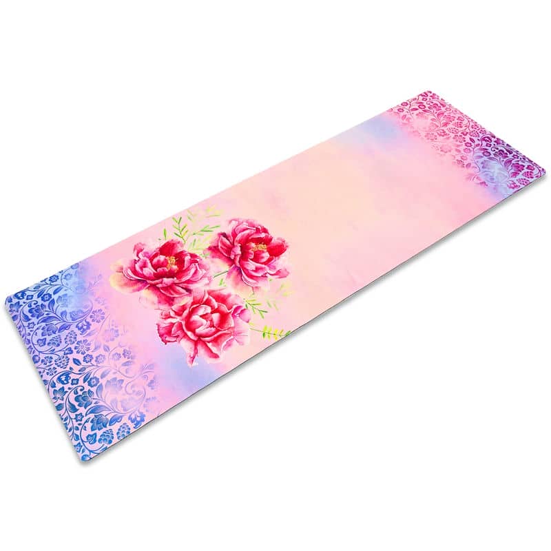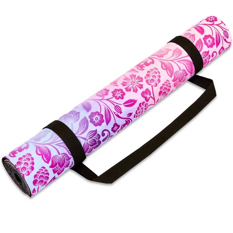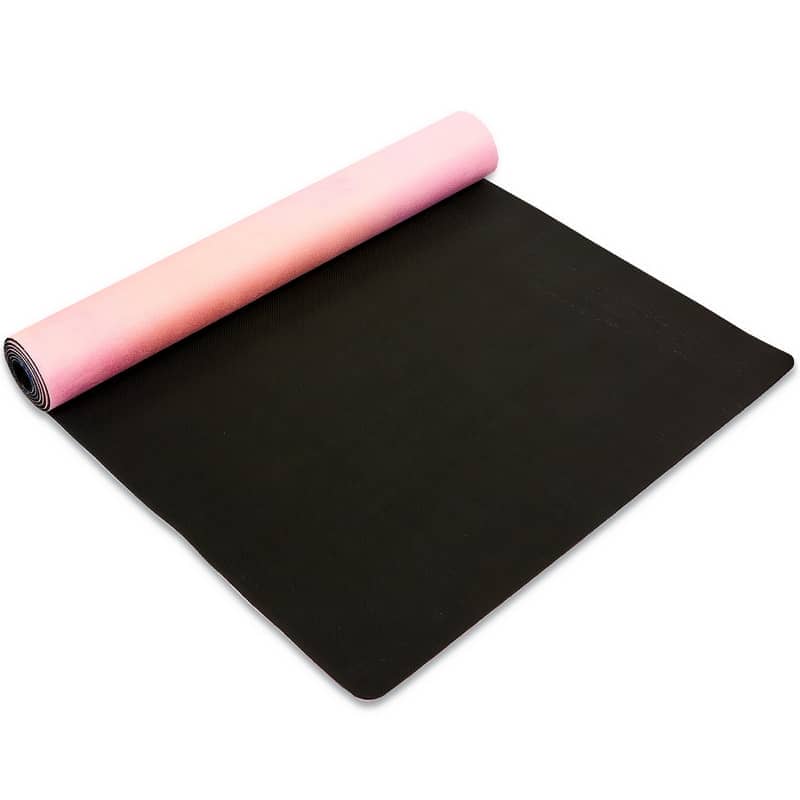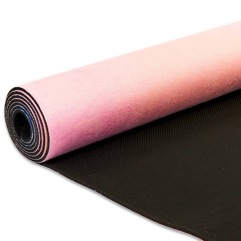 Двошаровий килимок складається з шару каучуку та шару замші. Замшевий верх має цікавий принт, який дає змогу не тільки комфортно тренуватися, а й отримувати естетичне задоволення від занять. Лицьова поверхня килимка не слизька. Відмінною липкістю володіє тильна сторона, виготовлена з каучуку. Цей матеріал добре прилипає до різних покриттів і точно не буде ковзати.