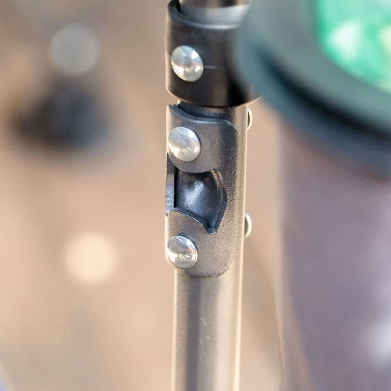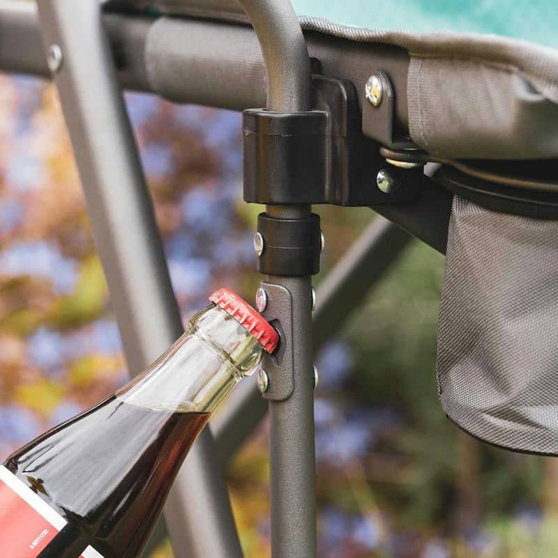 - Підстаканник, що вміщає стандартну півлітрову пляшку або термочашку, має металеве кріплення і компактно складається під каркас