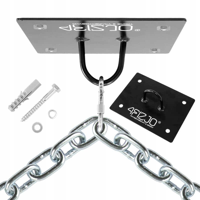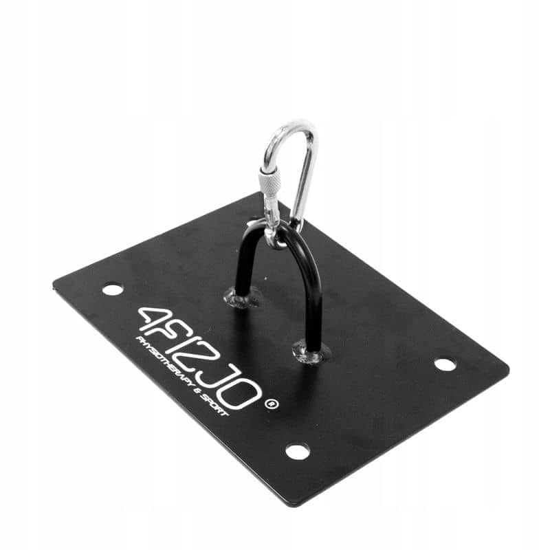 Кронштейн для груші від 4Fizjo виконаний з міцної сталі. Основа розміром 20 x 15 см та товщиною 3 мм, кріпиться на 4 дюбелі. Конструкція залишатиметься стабільною завдяки правильно відцентрованому зчіпному механізму. Це мінімізує ризик, що якийсь з гвинтів зірветься. В комплекті передбачено надійний карабін товщиною 6 мм, з його допомогою можна безпечно зафіксувати інвентар. Вся ж конструкція розрахована на максимальну вагу до 150 кг.