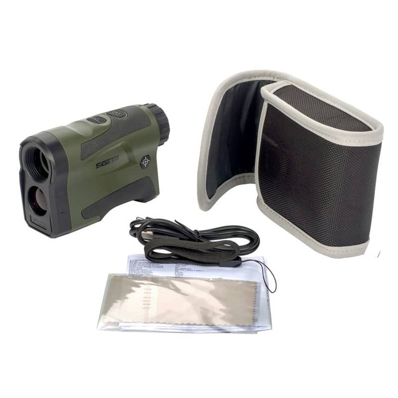 Лазерний далекомір для геодезичних та інженерних робіт, а також полювання та інших видів дозвілля. Незважаючи на неабияку досяжну дальність - 1 км - прилад має функцію визначення швидкостей об'єктів (що більше робоча дальність, тим складніше реалізувати цю можливість). Серед оптичних характеристик компактного далекоміра Sigeta iMeter LF1000A варто виділити широке поле зору - більше 130 м-код на 1 км. Інженери оцінять здатність приладу обчислювати висоту віддалених об'єктів, кут нахилу лінії ціль-об'єктив та її горизонтальну проекцію. Найважливішими перевагами для застосування моделі Sigeta iMeter LF1000A на полюванні є можливість вимірювання швидкостей та достатня потужність вбудованого акумулятора. для запобігання марною витратою заряду живлення далекоміра автоматично вимикається через 8 сек бездіяльності. У комплекті з далекоміром поставляються наручний ремінець і стильний чохол з карабіном.