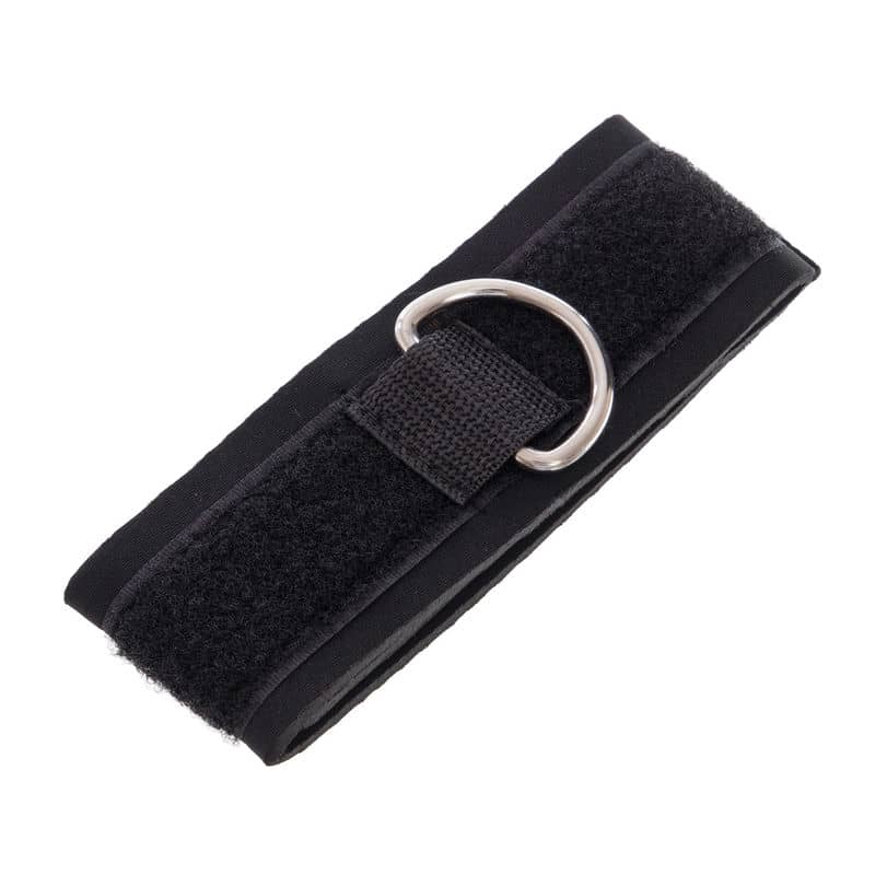 Основу лямки складає міцна нейлонова манжета, яка щільно охоплює щиколотку і фіксується за допомогою надійної застібки-липучки. Така конструкція не сковує руху та не порушує кровообіг, дозволяючи зосередитися на виконанні вправи. Завдяки регульованій довжині (50 х 5,5 см) манжета легко адаптується під розмір ноги користувача, забезпечуючи щільну та комфортну посадку. Для кріплення еспандерів або тренажерних тяг передбачено міцне металеве кільце, що стійко закріплене на манжеті.