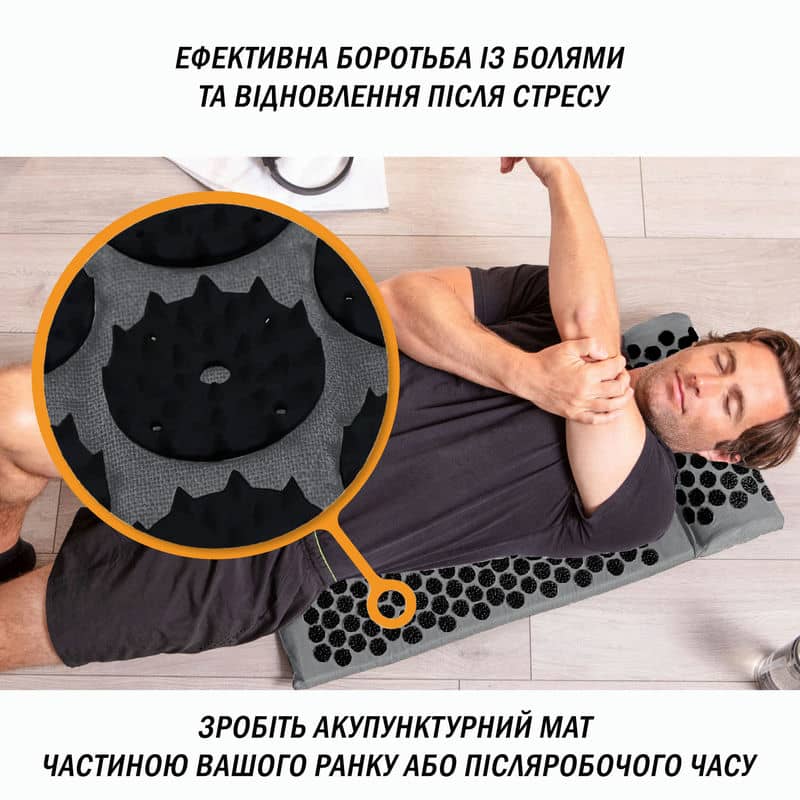 - Знімає стрес та покращує якість сну. Використання килимка з голками знижує напруженість та сприяє розслабленню.