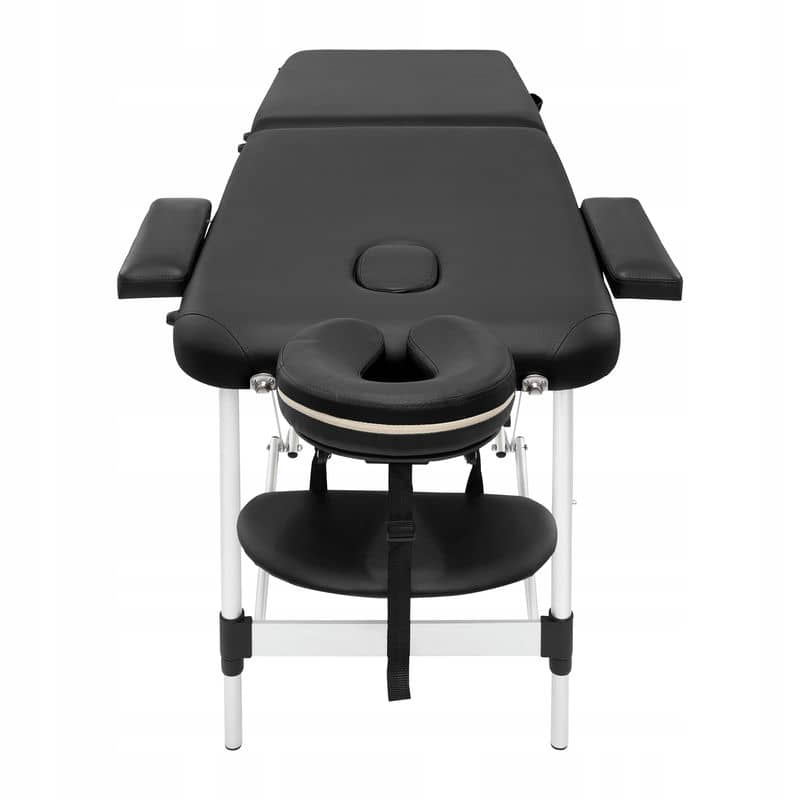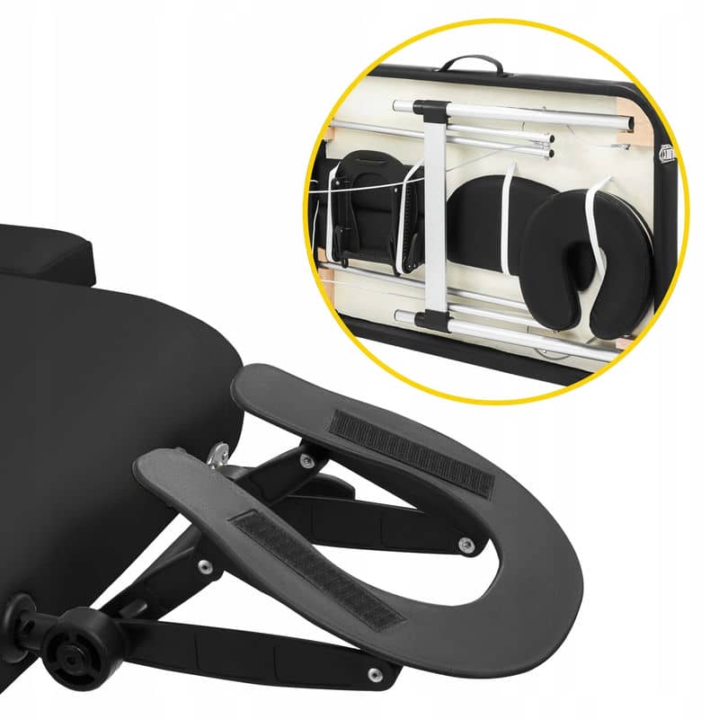 Масажний стіл від 4Fizjo сконструйований так, що всі елементи фіксуються нерухомо при складанні та поміщаються всередину транспортної сумки, що йде в комплекті. Каркас столу виконаний з алюмінію, завдяки чому він міцний та стійкий. Для додаткової безпеки конструкція столу підсилена стальними тросами, що утримують його від вібрації в розкладеному стані. Сегменти масажного столу покриті приємною на дотик екошкірою та наповнені м'якою піною, що адаптується до вигинів тіла. Борти закруглені для більшого комфорту використання. Стіл оснащений регульованими підлокітниками та полицею на якій також можна розмістити руки або використовувати її, як підставку для телефону. Профільований підголівник адаптується до форми обличчя та голови, тому не здавлює ніжні лицьові нерви. Виріб має безліч регулювань, що дозволить адаптувати його до різних видів діяльності.