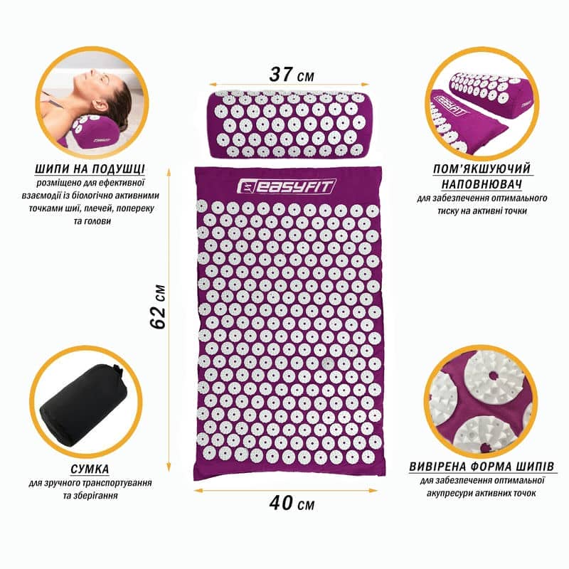 Набір килимок акупунктурний масажний + подушка Аплікатор Кузнєцова - комплект, цілеспрямовано підібраний не тільки для масажу, але й для релаксу організму, зняття стресу, а також позбавлення тіла целюліту. Позбавить організм від болю в суглобах, знизить напругу в м'язах, і дозволить позбавити від "апельсинової кірки" найбільш пікантні частинки тіла. Переваги масажного килимка Easyfit: Сучасна ультразвукова спайка колючок з тканиною, без смердючого та отруйного клею! Тобто повністю без будь-якої хімії! Повністю Еко!
