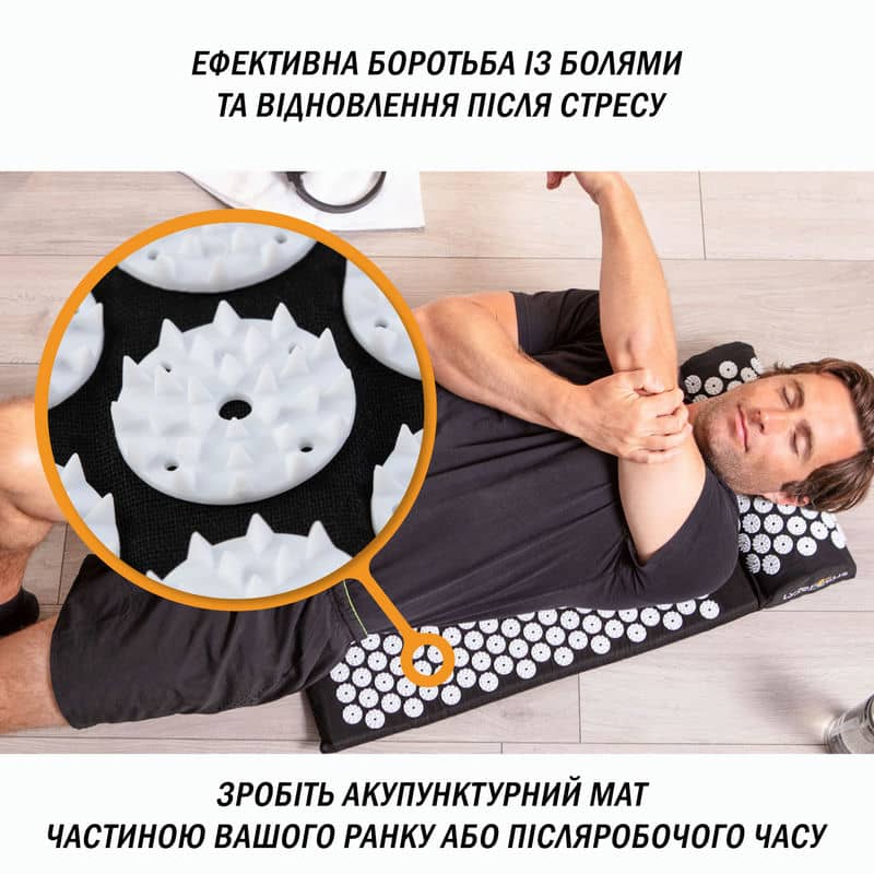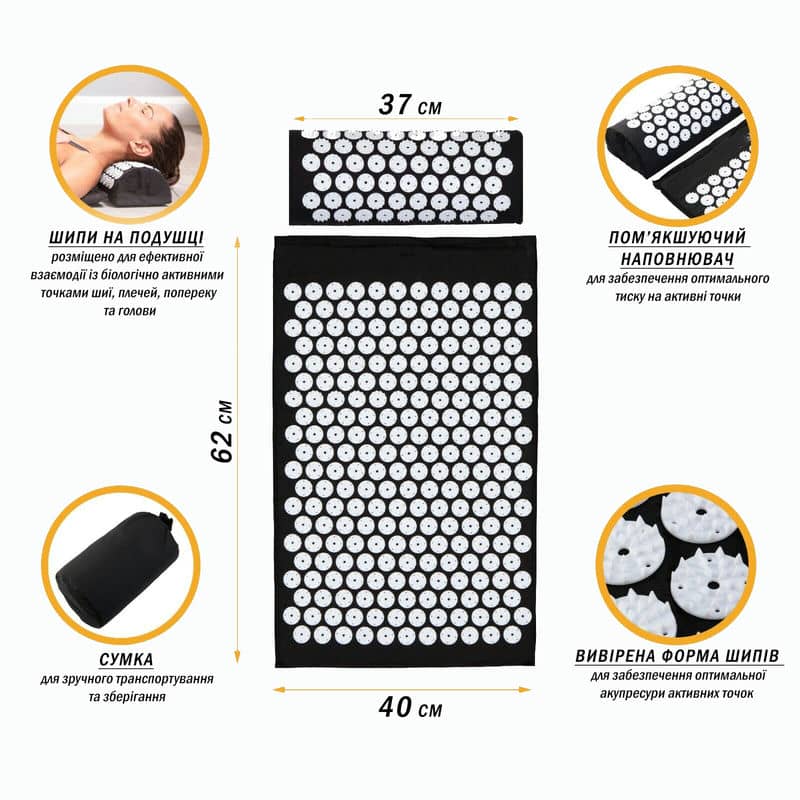 Набір килимок акупунктурний масажний + подушка Аплікатор Кузнєцова - комплект, цілеспрямовано підібраний не тільки для масажу, але й для релаксу організму, зняття стресу, а також позбавлення тіла целюліту. Позбавить організм від болю в суглобах, знизить напругу в м'язах, і дозволить позбавити від "апельсинової кірки" найпікантніші частинки тіла.
