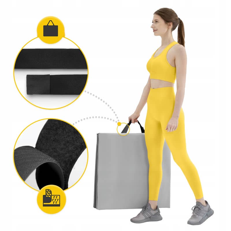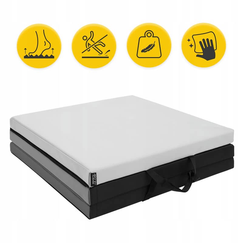 Гімнастичний мат від 4Fizjo складається з трьох з'єднаних елементів. Це дозволяє в будь-який момент компактно зібрати його до розміру 60 x 60 x 15 см й таким чином економити простір при зберіганні і транспортуванні аксесуару. Також мат обладнаний зручними ручками для відмінної мобільності. Для виготовлення виробу використовуються високоякісні матеріали, що є гарантією безпеки кожного тренування. Завдяки щільному, але водночас м'якому наповнювачу з пінополіетилену (EPE), досягається відмінний рівень комфорту. У свою чергу, верхній шар виконаний з матеріалу ПВХ, що має низьку схильність до деформації. Це дає відчуття стійкості при заняттях, а поверхня мату легка у догляді, її можна чистити та обробляти дезінфікуючими засобами. Верхній чохол має вбудовану блискавку, це полегшує процес чищення мату, а також дає змогу пересвідчитись у якості наповнювача.