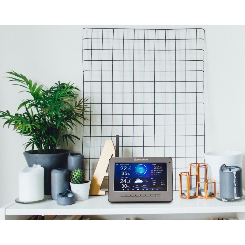 Сучасна професійна метеостанція з високоякісним 7-дюймовим кольоровим HD TFT дисплеєм і прогнозом погоди Bresser Professional WIFI HD TFT Colour Weather Center 7-in-1 Sensor (7003500) забезпечує вимірювання таких важливих метеопараметрів як величина атмосферного тиску, прогноз погоди, швидкість та напрям вітру, рівень опадів, рівень комфорту в приміщенні, інтенсивність випромінювання ультрафіолетових променів (UV), інтенсивність світла, температура та відносна вологість повітря. Функціонал станції дозволяє через WIFI обмінюватись даними на порталах: Weather Сloud, Weather Underground, ProWeatherLive, онлайн переглядати дані на смартфоні, планшеті чи комп'ютері. Можлива синхронізація з німецькою платформою погодних даних AWEKAS через Wi-Fi. Також історію даних можна експортувати на USB-накопичувач (не входить в комплект). Вбудована функція тривожних сповіщень попередить вас про вихід вимірюваних параметрів за вказані межі. Усі датчики скомпоновані в єдиному блоці, що значно спрощує та прискорює процес встановлення та монтажу, в комплекті додатковий безпроводний датчик температури і вологи. Сучасний висококонтрасний кольоровий HD TFT дисплей. Сучасний лаконічний дизайн та широкий спектр функцій дозволить з рівним успіхом використовувати цю метеостанцію як у квартирі, так і на присадибних ділянках.
