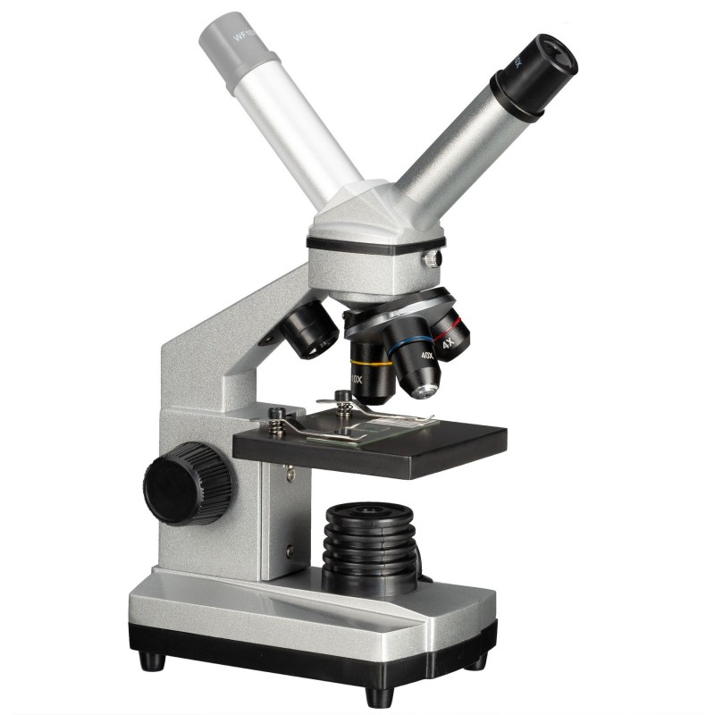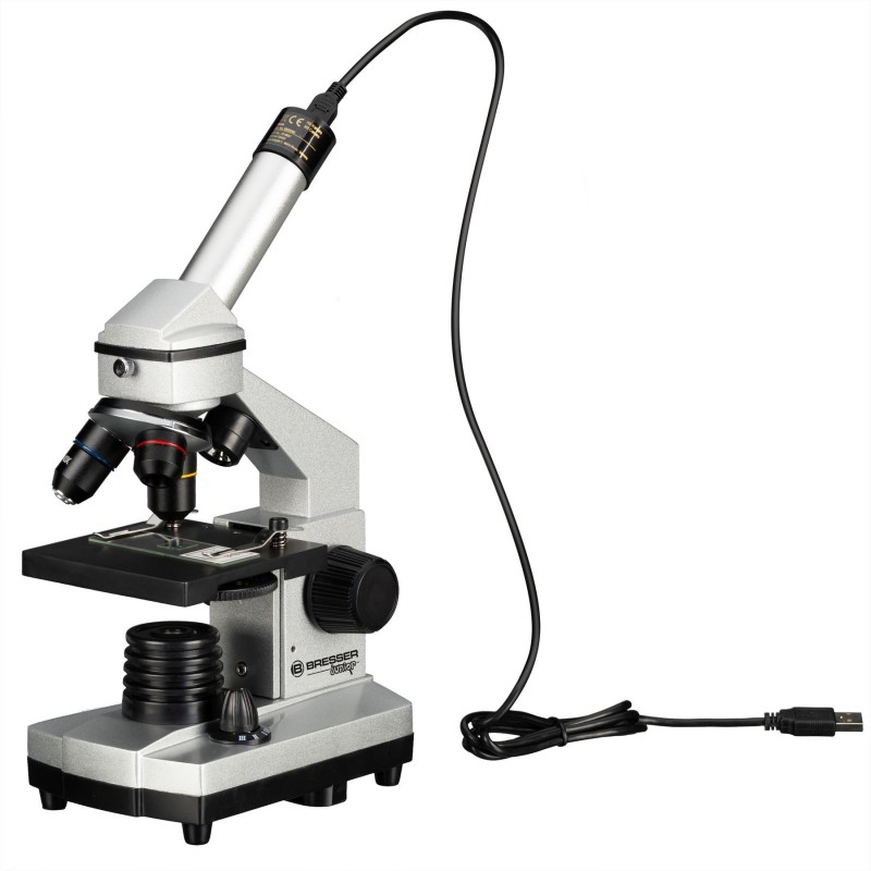Мікроскоп Bresser Junior 40x-1024x USB Camera з кейсом (8855000) - це цифрова, добре укомплектована модель мікроскопа з HD USB PC-мікроокуляром який забезпечує в реальному часі комфортне спостереження зразків безпосередньо з екрану монітора і дозволяє задокументувати свої спостереження і поділитися ними з друзями. З HD-камерою спостерігач може створювати і редагувати фотографії з роздільною здатністю 1280х720 в форматі JPEG та записувати відео в форматі AVI. Дана модель поставляється з широким набором аксесуарів, об'єктивів і окулярів, необхідних для спостережень, що дає можливість відразу зануритися в цікавий і захоплюючий мікросвіт. Зручний та легкий пластиковий кейс призначений для зберігання та транспортування мікроскопа, аксесуарів та приладдя. Водночас прилад оснащено якісною скляною мультипросвітленою оптикою, що робить його цікавим не лише підліткам, а й дорослим. Комбінація двох ширококутних окулярів та трьох об'єктивів дає можливість отримати збільшення 640х. Вдалим рішенням є використання в мікроскопі лінзи Барлоу для отримання безступінчастого (плавного) масштабування зображення, завдяки чому досягається максимальне збільшення 1024х. Монокулярна насадка, нахилена під кутом 45°, повертається на 360°, дозволяючи спостерігати у будь-якому зручному положенні, і навіть працювати з мікроскопом групі дітей чи дорослих без переміщення мікроскопа у просторі. Мікроскоп забезпечений комбінованим підсвічуванням - двома світлодіодними лампами, розміщеними над і під предметним столиком. Світло, що проходить скрізь зразок, використовується для спостереження прозорих об'єктів, світло що відбивається – для непрозорих тривимірних зразків. Використання двох ламп одночасно може бути корисним при спостереженні напівпрозорих зразків. Яскравість освітлення, передача кольору і спрямованість пучка світла контролюється діафрагмою з різними діаметрами отворів і п'ятьма світлофільтрами. Перелік аксесуарів включає готові слайди, до огляду яких можна розпочати негайно. Також у наборі є аксесуари для препарування зразків, мікротом для самостійного приготування зразків, інкубаторій та готові препарати. Живлення мікроскопа здійснюється від мережі змінного струму.