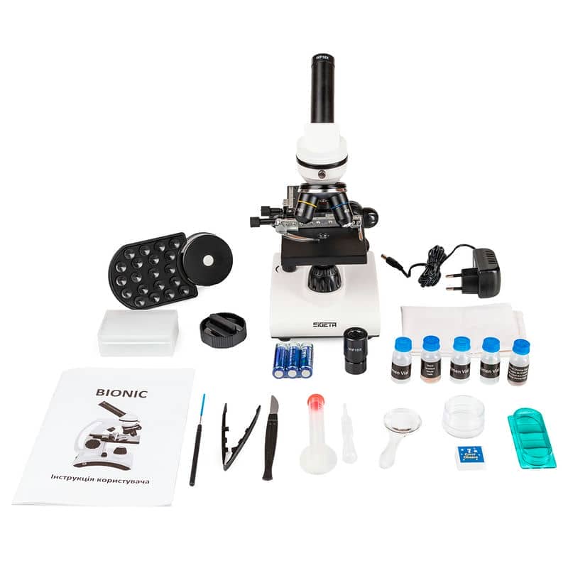 Sigeta Bionic 40x-640x — це шкільний (навчальний) біологічний мікроскоп із широким діапазоном збільшень, багатим функціоналом та продуманою комплектацією. Прекрасно підходить для вивчення мікросвіту та стане розумним вибором для дітей шкільного віку та старших. У комплект поставки включено вичерпний набір додаткових аксесуарів: смартфон-адаптер, інструменти для препарування, ємності для розведення, набір готових мікропрепаратів і порожнього скла, що дозволить приступити відразу ж до експериментів і досліджень мікросвіту.