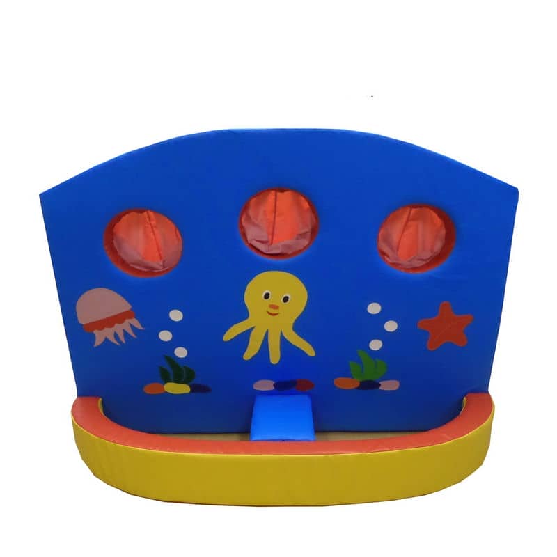 Опис: Виріб призначений для розробки вестибулярного апарату, розвитку влучності, точності рухів. Являє собою ігровий модуль з отворами для закидання м'ячиків. Перед стінкою тиру передбачено невелике огороджене простір за типом сухого басейну, куди потрапляють не долетіли в ціль м'ячі. За ним - спеціальна сітка для м'ячів, долетіли до мети. Використовувати моделі даної серії можна одному або декільком дітям для проведення ігор в дитячому садку або в домашніх умовах. Модульний тир дозволяє малятам освоювати поняття конкурсів, перемог, духу суперництва.