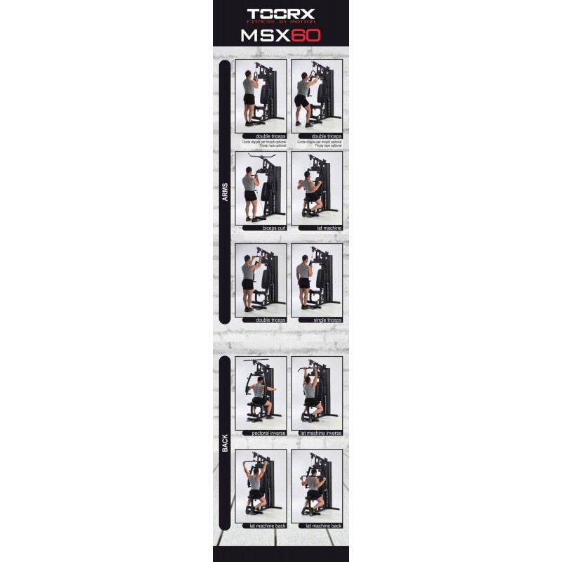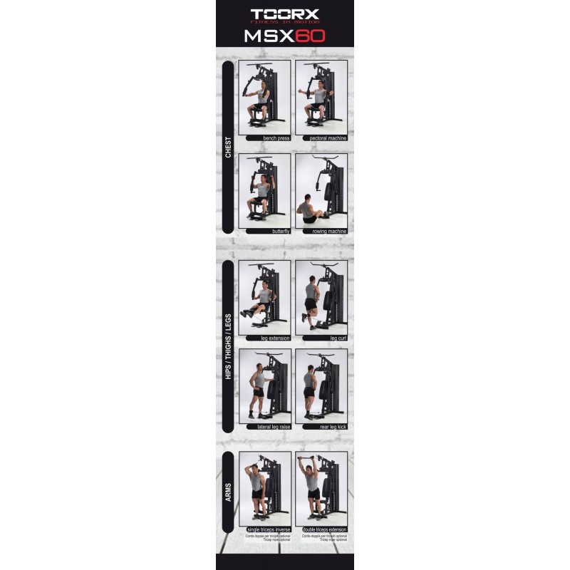 Мультистанція Toorx Multifunction Station MSX 60 (MSX-60) - універсальний багатофункціональний силовий тренажер для дому, за допомогою якого ви зможете підтримувати своє тіло в належній формі. Завдяки продуманій конструкції та комплектації додатковими пристосуваннями, на тренажері можливо виконувати багато різних силових вправ на всі групи м'язів. Дана модель має 70-кілограмовий набірний ваговий стек для достатнього рівня навантаження. Безперечна перевага фітнес-станції - її компактні розміри, що дозволяють користуватися тренажером навіть в умовах міської квартири.