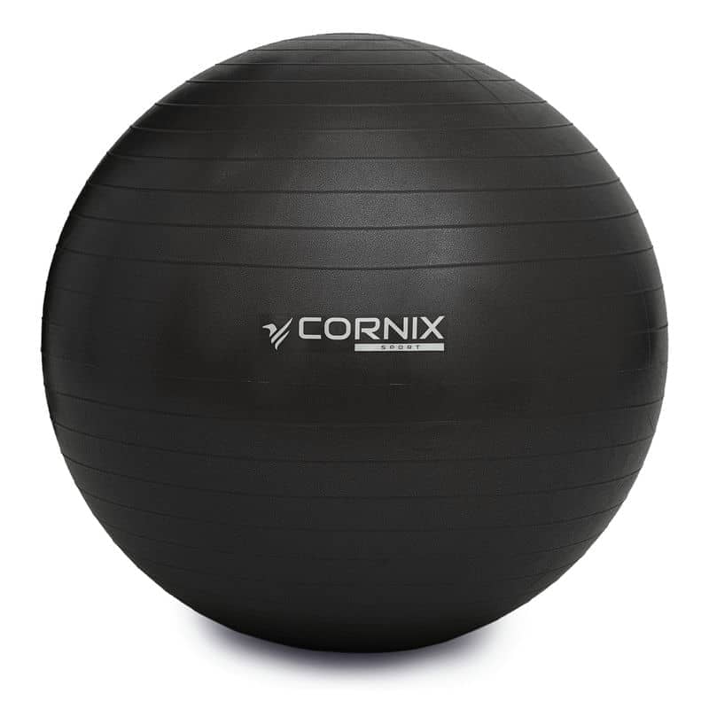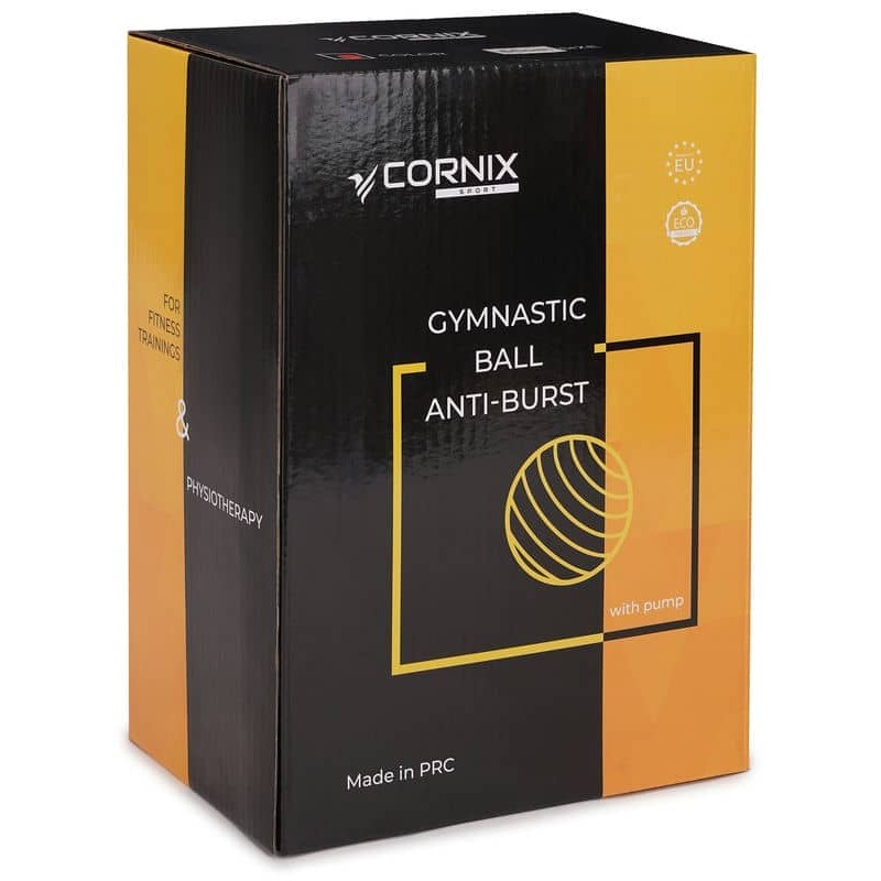Гімнастичний м'яч Cornix виконаний з високоякісного матеріалу ПВХ, розрахований на максимальне навантаження 150 кг. На додаток, інвентар має систему Anti-Burst, яка запобігатиме розриву м'яча при механічному пошкодженні. Його поверхня має протиковзкі властивості, що робить вправи з фітболом не тільки ефективними, але і безпечними. У комплекті передбачено насос для швидкого накачування.