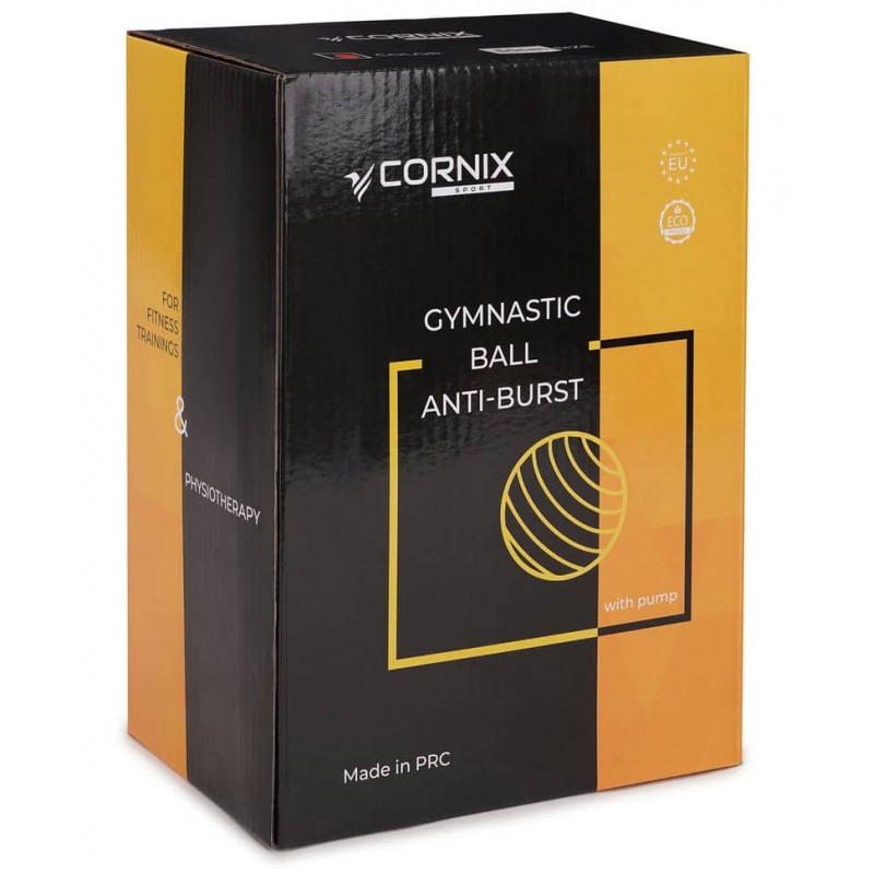 Гімнастичний м'яч Cornix виконаний з високоякісного матеріалу ПВХ, розрахований на максимальне навантаження 150 кг. На додаток, інвентар має систему Anti-Burst, яка запобігатиме розриву м'яча при механічному пошкодженні. Його поверхня має протиковзкі властивості, що робить вправи з фітболом не тільки ефективними, але і безпечними. У комплекті передбачено насос для швидкого накачування.