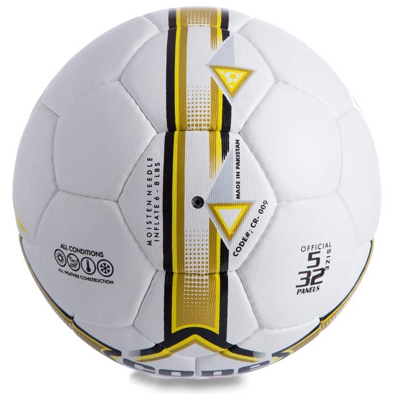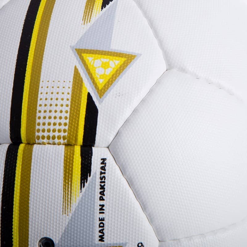 Яскравий біло-жовтий дизайн з контрастними чорними швами робить цей м'яч напрочуд помітним на полі, особливо в умовах поганого освітлення або похмурої погоди. Його виразний глянець і графіка надають м’ячу позачасовий стиль.