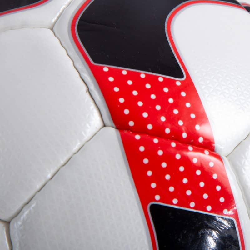 Дизайн із виразною білою, чорною та червоною палітрою відразу привертає увагу. Таке поєднання не лише візуально сучасне, але й підвищує видимість м’яча навіть у умовах поганого освітлення. Графіка у формі алмазного візерунка робить цю модель справжньою знахідкою для тих, хто прагне вирізнятись на полі, а майже непомітні шви покращують не лише естетику, а й аеродинаміку м’яча.