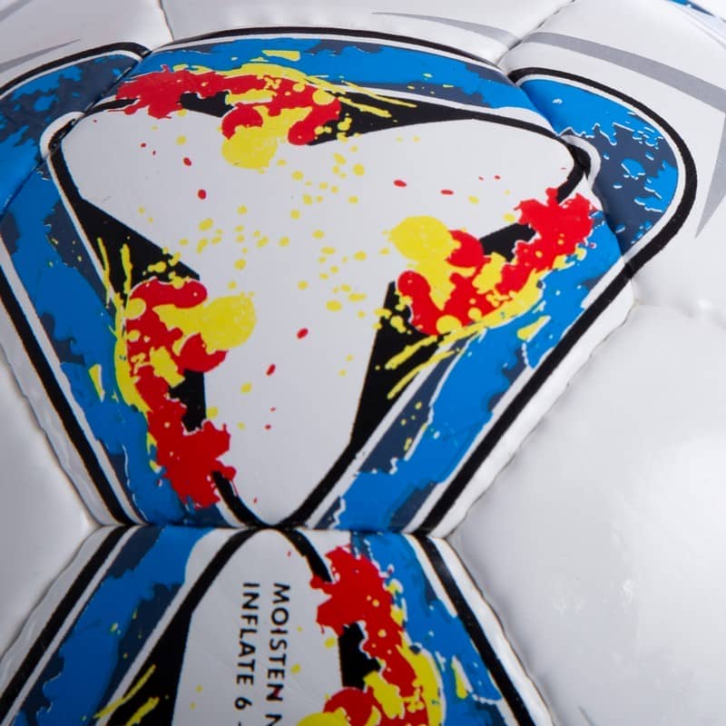 Звичайний спортивний дизайн з біло-блакитним кольоровим рішенням і контрастними динамічними вставками робить цей м'яч візуально помітним на полі. Поверхня також прикрашена акцентованими швами і геометричними лініями, що надають йому спортивного характеру. Такі деталі не лише підкреслюють преміальний вигляд, а й допомагають гравцеві краще візуалізувати траєкторію обертання.
